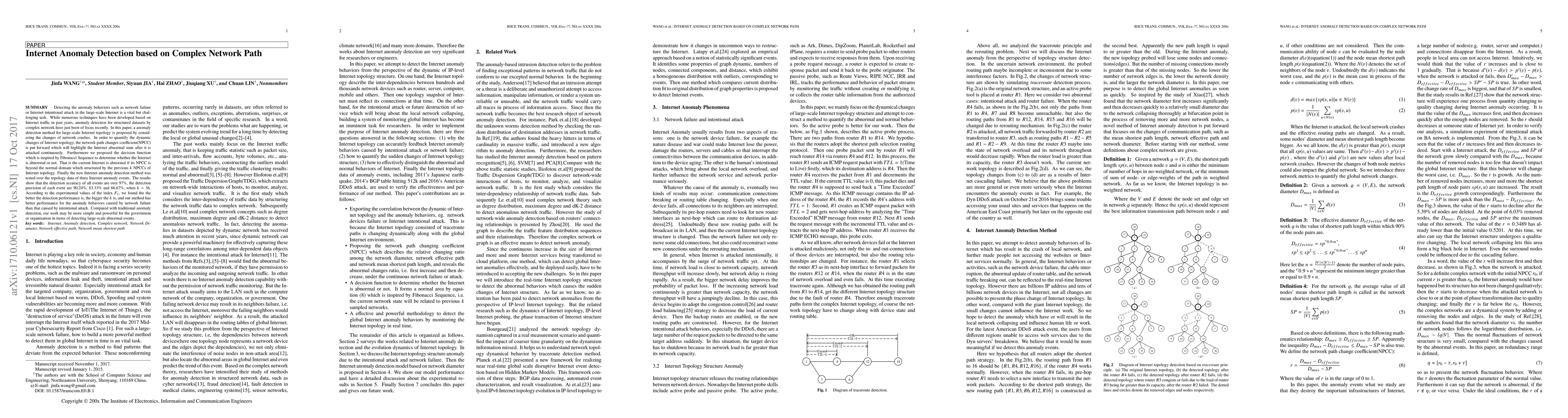 Detecting the anomaly behaviors such as network failure or Internet intentional attack in the large-scale Internet is a vital but challenging task. While numerous techniques have been developed based on Internet traffic in past years, anomaly detection for structured datasets by complex network have just been of focus recently. In this paper, a anomaly detection method for large-scale Internet topology is proposed by considering the changes of network crashes. In order to quantify the dynamic changes of Internet topology, the network path changes coefficient(NPCC) is put forward which will highlight the Internet abnormal state after it is attacked continuously. Furthermore we proposed the decision function which is inspired by Fibonacci Sequence to determine whether the Internet is abnormal or not. That is the current Internet is abnormal if its NPCC is beyond the normal domain which structured by the previous k NPCCs of Internet topology. Finally the new Internet anomaly detection method was tested over the topology data of three Internet anomaly events. The results show that the detection accuracy of all events are over 97%, the detection precision of each event are 90.24%, 83.33% and 66.67%, when k = 36. According to the experimental values of the index F_1, we found the the better the detection performance is, the bigger the k is, and our method has better performance for the anomaly behaviors caused by network failure than that caused by intentional attack. Compared with traditional anomaly detection, our work may be more simple and powerful for the government or organization in items of detecting large-scale abnormal events.