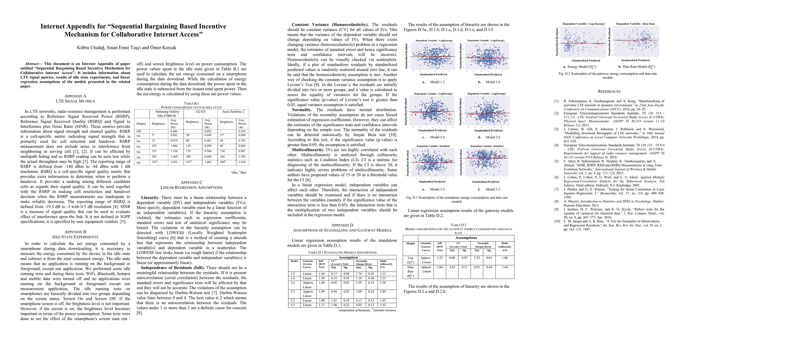 This Internet Appendix provides detailed LTE signal metrics, results from idle state experiments, and linear regression assumptions for the incentive mechanism models in the main paper on sequential bargaining for collaborative internet access.