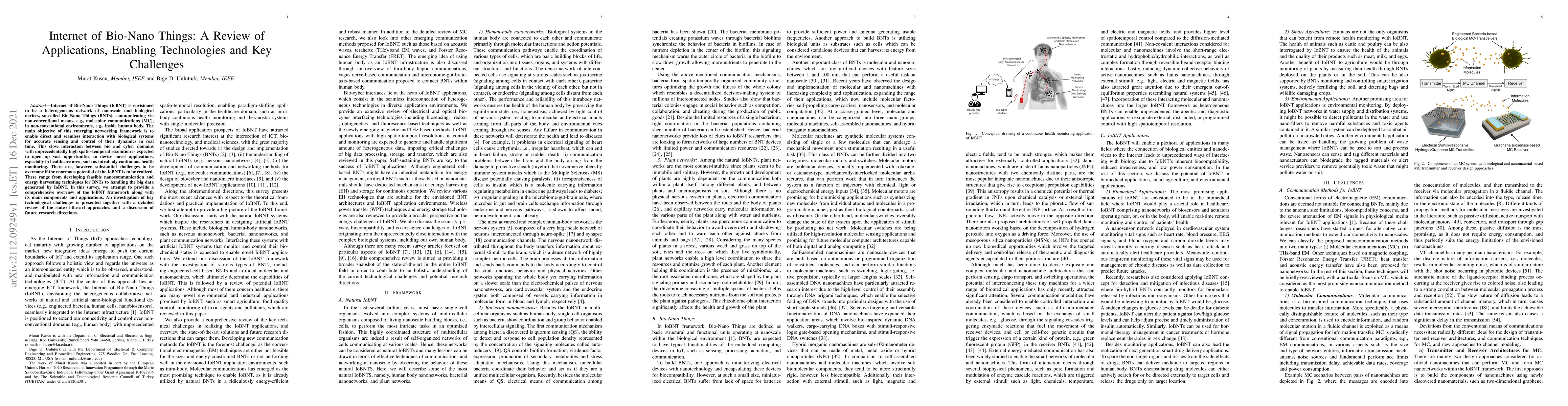 This paper reviews the Internet of Bio-Nano Things (IoBNT), a network of nanoscale and biological devices for real-time interaction with biological systems, highlighting its healthcare applications and the technological challenges in nanocommunication, energy harvesting, and big data management. It also discusses future research directions.