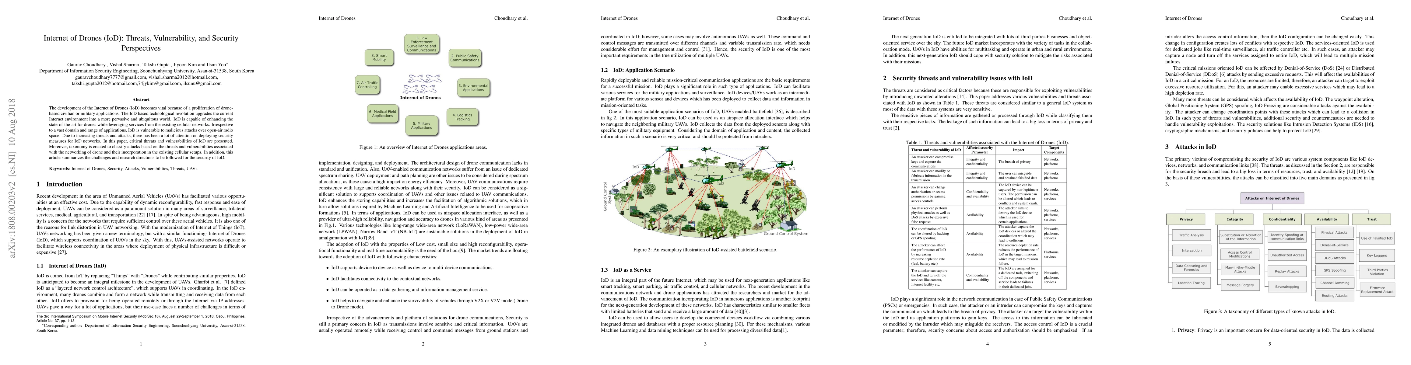 This paper examines the threats and vulnerabilities inherent to the Internet of Drones (IoD), highlighting its potential for enhancing drone applications while leveraging existing cellular networks. It outlines a taxonomy for classifying attacks and discusses the challenges and future research directions necessary for securing IoD networks against malicious attacks.