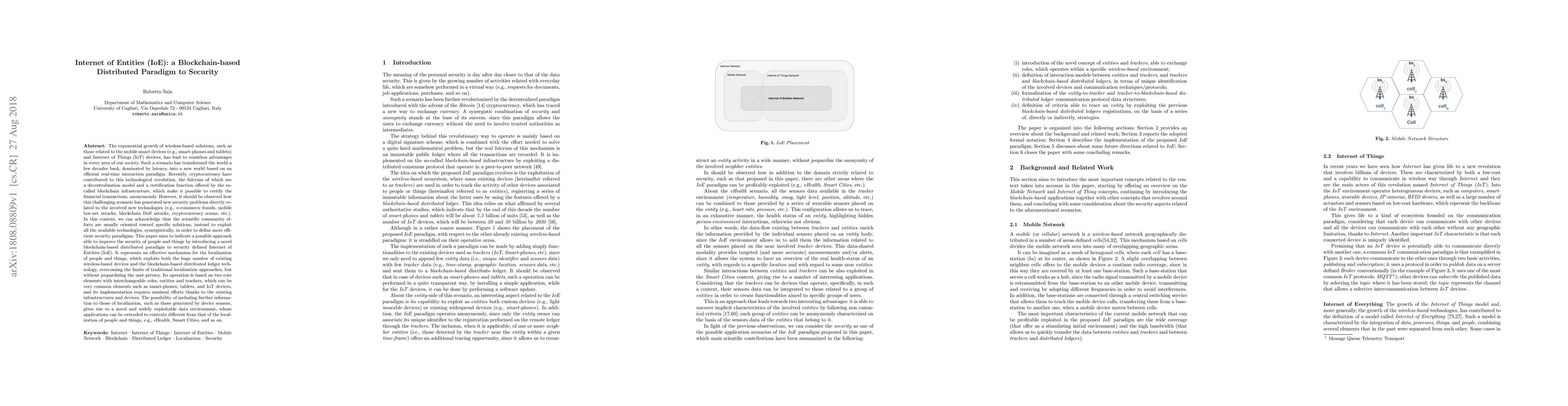 The exponential growth of wireless-based solutions, such as those related to the mobile smart devices (e.g., smart-phones and tablets) and Internet of Things (IoT) devices, has lead to countless advantages in every area of our society. Such a scenario has transformed the world a few decades back, dominated by latency, into a new world based on an efficient real-time interaction paradigm.Recently, cryptocurrency have contributed to this technological revolution, the fulcrum of which are a decentralization model and a certification function offered by the so-called blockchain infrastructure, which make it possible to certify the financial transactions, anonymously. However, it should be observed how this challenging scenario has generated new security problems directly related to the involved new technologies (e.g., e-commerce frauds, mobile bot-net attacks, blockchain DoS attacks, cryptocurrency scams, etc.). In this context, we can acknowledge that the scientific community efforts are usually oriented toward specific solutions, instead to exploit all the available technologies, synergistically, in order to define more efficient security paradigms. This paper aims to indicate a possible approach able to improve the security of people and things by introducing a novel paradigm to security defined Internet of Entities (IoE). It is a mechanism for the localization of people and things, which exploits both the huge number of existing wireless-based devices and the blockchain-based distributed ledger technology, overcoming the limits of traditional localization approaches, but without jeopardizing the user privacy. Its operation is based on two core elements with interchangeable roles, entities and trackers, which can be very common elements such as smart-phones, tablets, and IoT devices, and its implementation requires minimal efforts thanks to the existing infrastructures and devices.