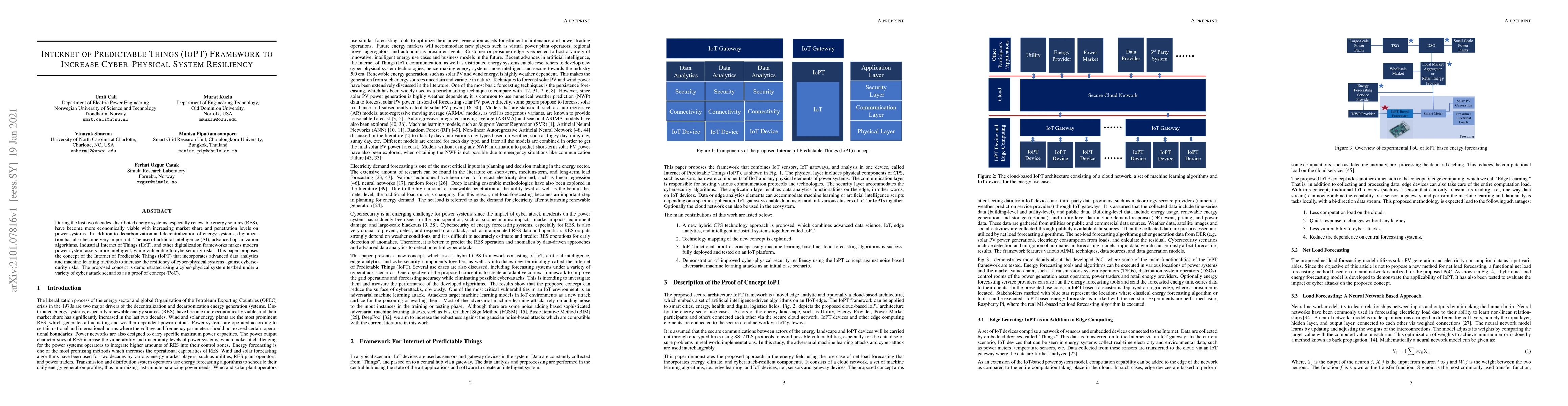 During the last two decades, distributed energy systems, especially renewable energy sources (RES), have become more economically viable with increasing market share and penetration levels on power systems. In addition to decarbonization and decentralization of energy systems, digitalization has also become very important. The use of artificial intelligence (AI), advanced optimization algorithms, Industrial Internet of Things (IIoT), and other digitalization frameworks makes modern power system assets more intelligent, while vulnerable to cybersecurity risks. This paper proposes the concept of the Internet of Predictable Things (IoPT) that incorporates advanced data analytics and machine learning methods to increase the resiliency of cyber-physical systems against cybersecurity risks. The proposed concept is demonstrated using a cyber-physical system testbed under a variety of cyber attack scenarios as a proof of concept (PoC).