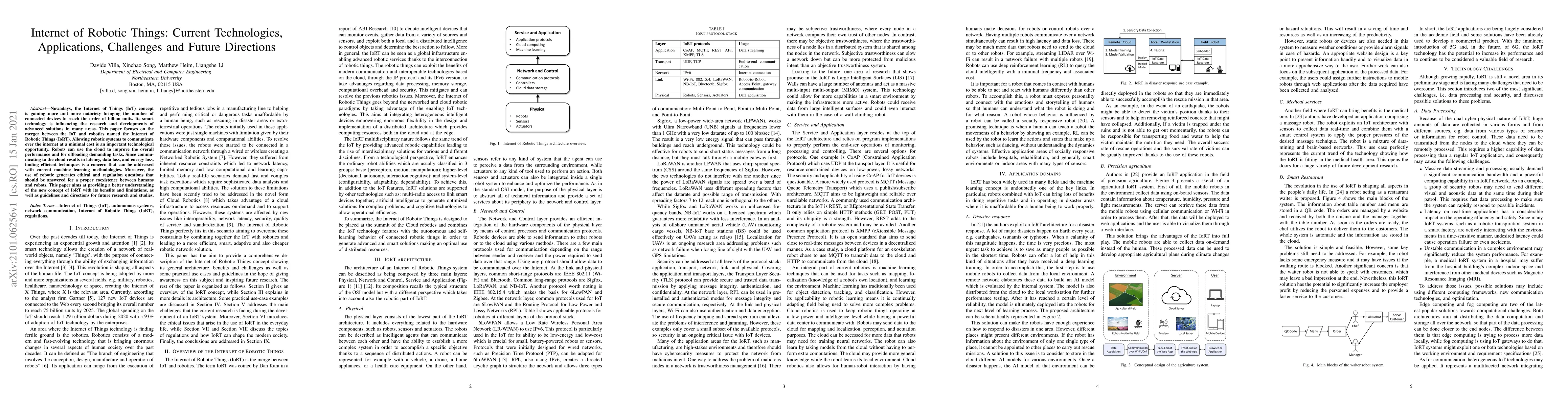 Nowadays, the Internet of Things (IoT) concept is gaining more and more notoriety bringing the number of connected devices to reach the order of billion units. Its smart technology is influencing the research and developments of advanced solutions in many areas. This paper focuses on the merger between the IoT and robotics named the Internet of Robotic Things (IoRT). Allowing robotic systems to communicate over the internet at a minimal cost is an important technological opportunity. Robots can use the cloud to improve the overall performance and for offloading demanding tasks. Since communicating to the cloud results in latency, data loss, and energy loss, finding efficient techniques is a concern that can be addressed with current machine learning methodologies. Moreover, the use of robotic generates ethical and regulation questions that should be answered for a proper coexistence between humans and robots. This paper aims at providing a better understanding of the new concept of IoRT with its benefits and limitations, as well as guidelines and directions for future research and studies.