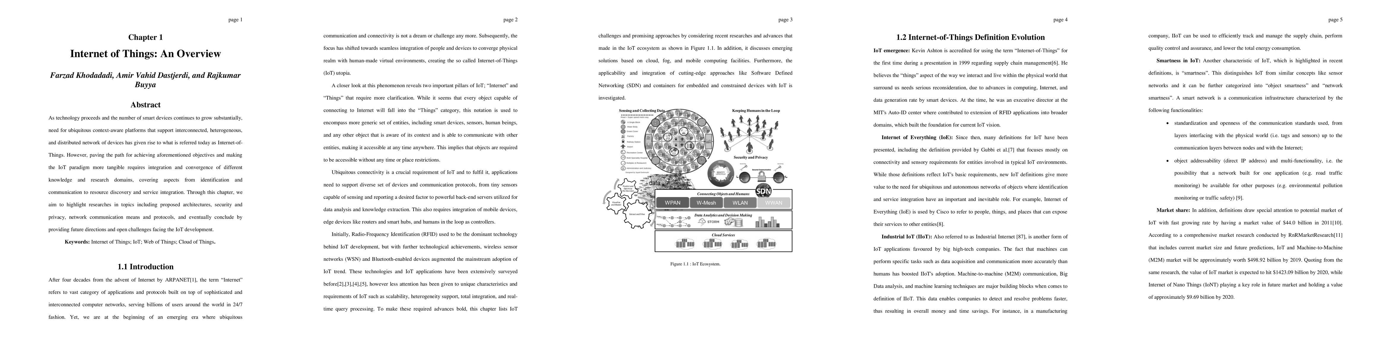 As technology proceeds and the number of smart devices continues to grow substantially, need for ubiquitous context-aware platforms that support interconnected, heterogeneous, and distributed network of devices has given rise to what is referred today as Internet-of-Things. However, paving the path for achieving aforementioned objectives and making the IoT paradigm more tangible requires integration and convergence of different knowledge and research domains, covering aspects from identification and communication to resource discovery and service integration. Through this chapter, we aim to highlight researches in topics including proposed architectures, security and privacy, network communication means and protocols, and eventually conclude by providing future directions and open challenges facing the IoT development.