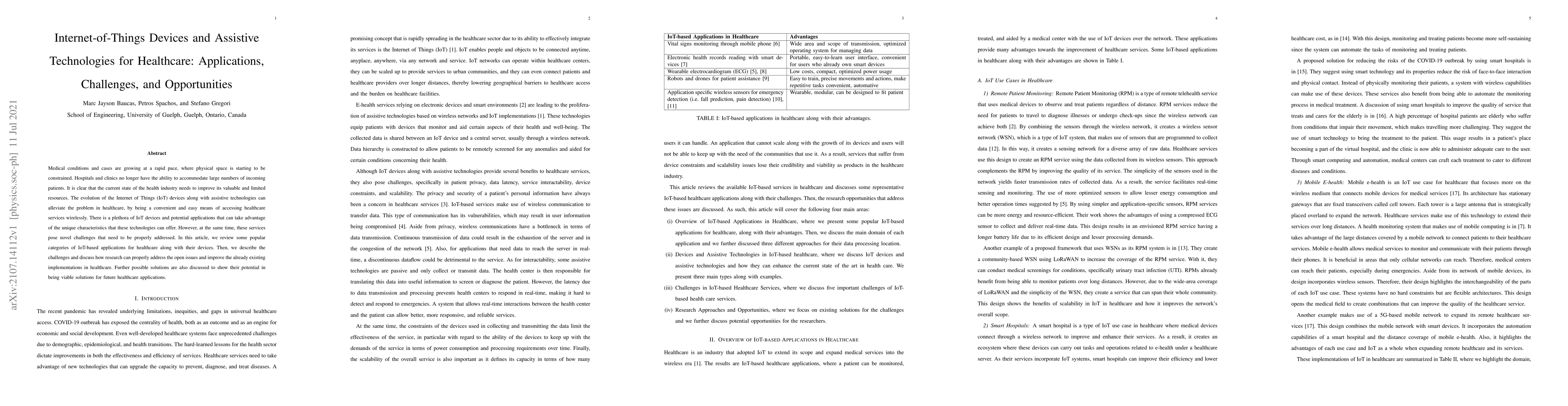 The Internet of Things (IoT) devices and assistive technologies have the potential to improve healthcare services by providing convenient wireless access to care. Despite their promise, these technologies also pose challenges that need to be addressed through research and improved implementation to enhance future healthcare applications.