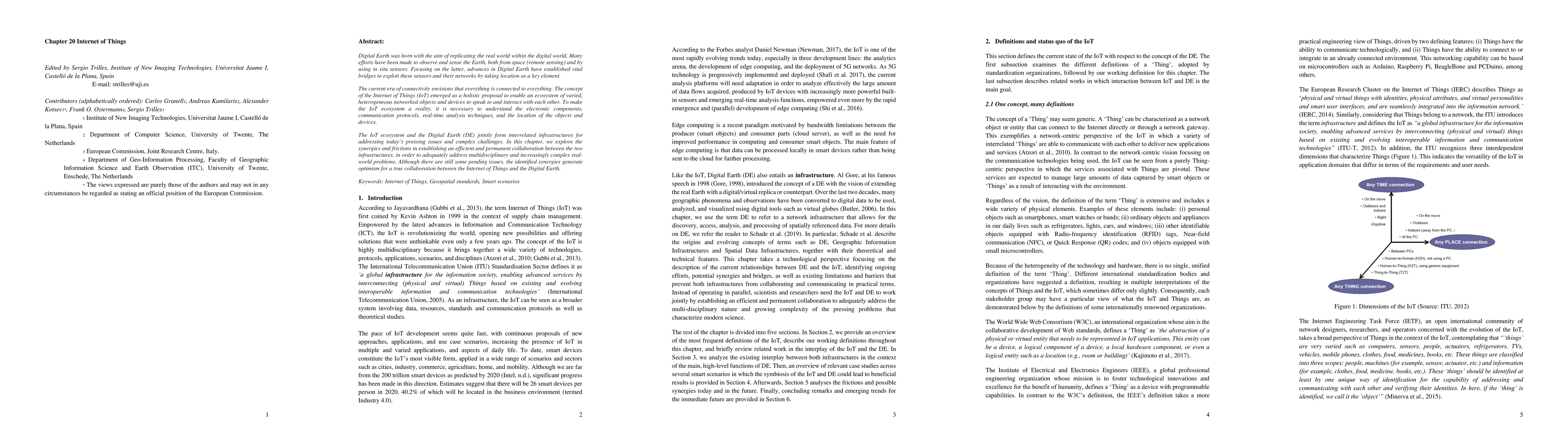 Digital Earth was born with the aim of replicating the real world within the digital world. Many efforts have been made to observe and sense the Earth, both from space and by using in situ sensors. Focusing on the latter, advances in Digital Earth have established vital bridges to exploit these sensors and their networks by taking location as a key element. The current era of connectivity envisions that everything is connected to everything. The concept of the Internet of Things emerged as a holistic proposal to enable an ecosystem of varied, heterogeneous networked objects and devices to speak and interact with each other. To make the IoT ecosystem a reality, it is necessary to understand the electronic components, communication protocols, real-time analysis techniques, and the location of the objects and devices. The IoT ecosystem and the Digital Earth jointly form interrelated infrastructures for addressing modern pressing issues and complex challenges. In this chapter, we explore the synergies and frictions in establishing an efficient and permanent collaboration between the two infrastructures, in order to adequately address multidisciplinary and increasingly complex real-world problems. Although there are still some pending issues, the identified synergies generate optimism for a true collaboration between the Internet of Things and the Digital Earth.