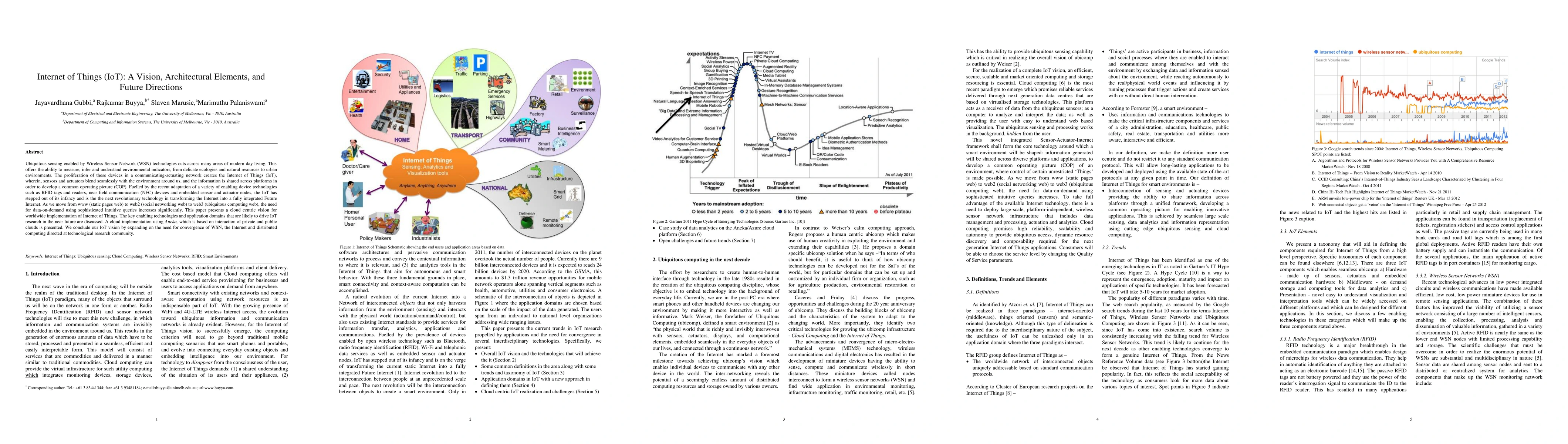 This paper explores the Internet of Things (IoT) as a transformative technology, emphasizing its ubiquitous sensing capabilities enabled by Wireless Sensor Networks. It discusses the architectural elements and future directions of IoT, highlighting the convergence of WSN, the Internet, and distributed computing, and proposes a cloud-centric implementation using Aneka for global IoT deployment.