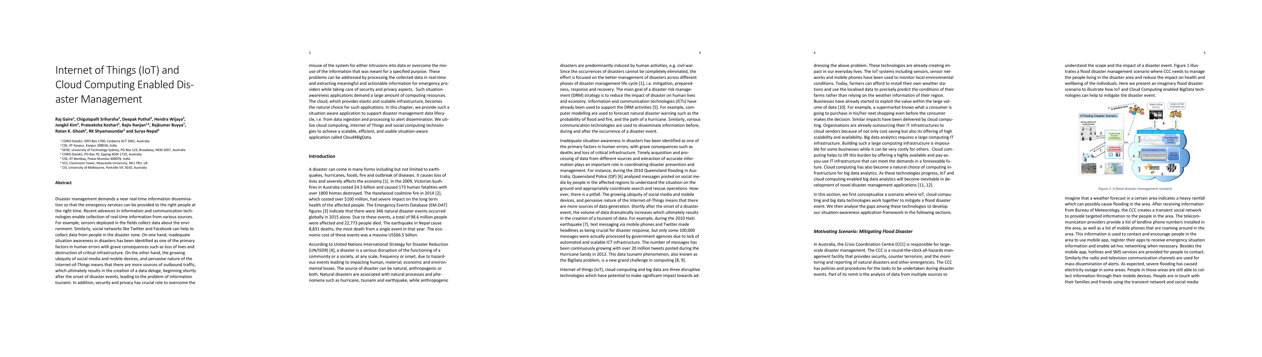 Disaster management demands a near real-time information dissemina-tion so that the emergency services can be provided to the right people at the right time. Recent advances in information and communication technologies enable collection of real-time information from various sources. For example, sensors deployed in the fields collect data about the environment. Similarly, social networks like Twitter and Facebook can help to collect data from people in the disaster zone. On one hand, inadequate situation awareness in disasters has been identified as one of the primary factors in human errors with grave consequences such as loss of lives and destruction of critical infrastructure. On the other hand, the growing ubiquity of social media and mobile devices, and pervasive nature of the Internet-of-Things means that there are more sources of outbound traffic, which ultimately results in the creation of a data deluge, beginning shortly after the onset of disaster events, leading to the problem of information tsunami. In addition, security and privacy has crucial role to overcome the misuse of the system for either intrusions into data or overcome the misuse of the information that was meant for a specified purpose. .... In this chapter, we provide such a situation aware application to support disaster management data lifecycle, i.e. from data ingestion and processing to alert dissemination. We utilize cloud computing, Internet of Things and social computing technologies to achieve a scalable, effi-cient, and usable situation-aware application called Cloud4BigData.