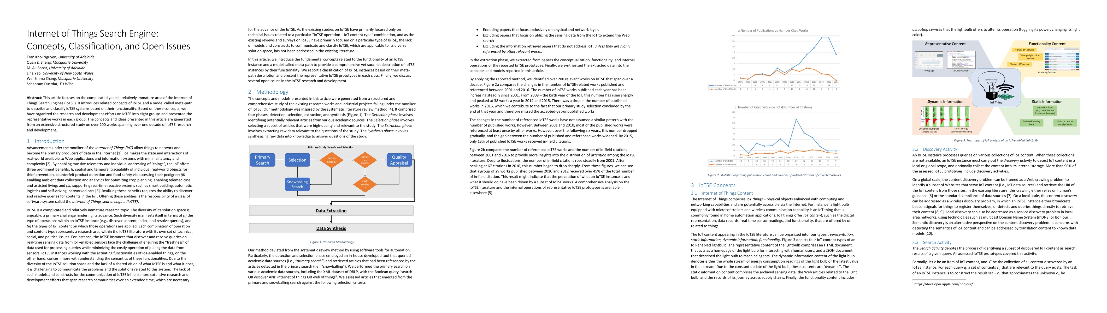 This article focuses on the complicated yet still relatively immature area of the Internet of Things Search Engines (IoTSE). It introduces related concepts of IoTSE and a model called meta-path to describe and classify IoTSE systems based on their functionality. Based on these concepts, we have organized the research and development efforts on IoTSE into eight groups and presented the representative works in each group. The concepts and ideas presented in this article are generated from an extensive structured study on over 200 works spanning over one decade of IoTSE research and development.