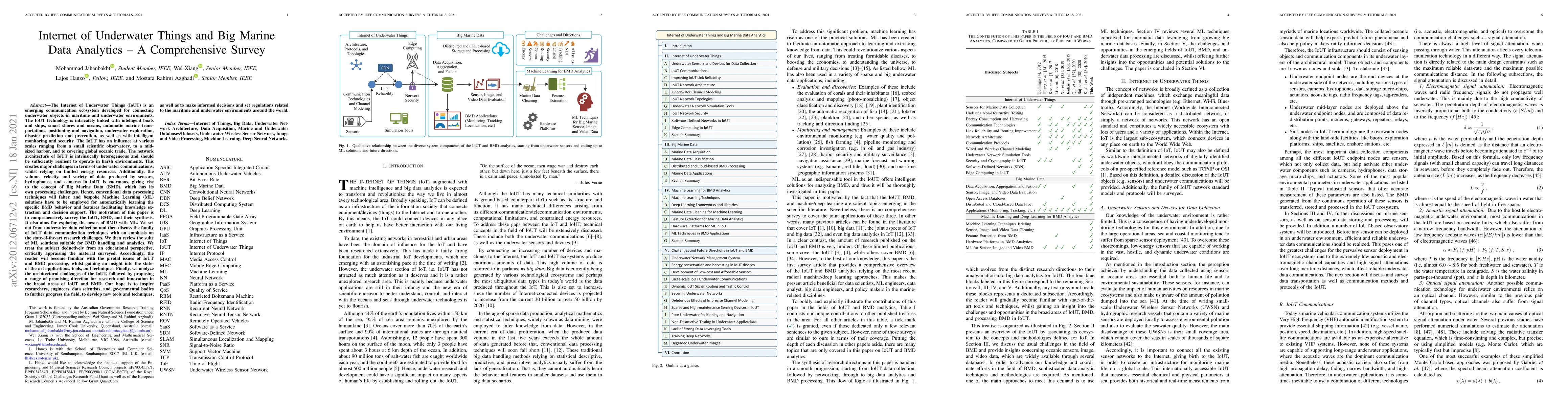The Internet of Underwater Things (IoUT) is an emerging communication ecosystem developed for connecting underwater objects in maritime and underwater environments. The IoUT technology is intricately linked with intelligent boats and ships, smart shores and oceans, automatic marine transportations, positioning and navigation, underwater exploration, disaster prediction and prevention, as well as with intelligent monitoring and security. The IoUT has an influence at various scales ranging from a small scientific observatory, to a midsized harbor, and to covering global oceanic trade. The network architecture of IoUT is intrinsically heterogeneous and should be sufficiently resilient to operate in harsh environments. This creates major challenges in terms of underwater communications, whilst relying on limited energy resources. Additionally, the volume, velocity, and variety of data produced by sensors, hydrophones, and cameras in IoUT is enormous, giving rise to the concept of Big Marine Data (BMD), which has its own processing challenges. Hence, conventional data processing techniques will falter, and bespoke Machine Learning (ML) solutions have to be employed for automatically learning the specific BMD behavior and features facilitating knowledge extraction and decision support. The motivation of this paper is to comprehensively survey the IoUT, BMD, and their synthesis. It also aims for exploring the nexus of BMD with ML. We set out from underwater data collection and then discuss the family of IoUT data communication techniques with an emphasis on the state-of-the-art research challenges. We then review the suite of ML solutions suitable for BMD handling and analytics. We treat the subject deductively from an educational perspective, critically appraising the material surveyed.