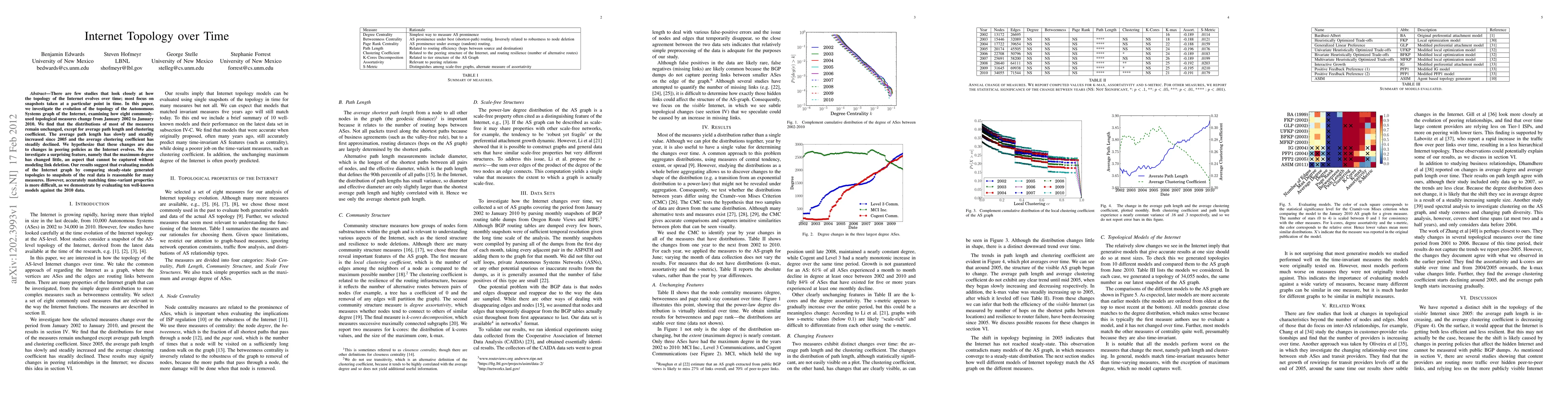 This paper examines the evolution of Internet topology from 2002 to 2010, finding that while most topological measures remain stable, the average path length has increased and the clustering coefficient has declined, likely due to changes in peering policies. The study also highlights the challenge of accurately modeling time-variant properties of the Internet.