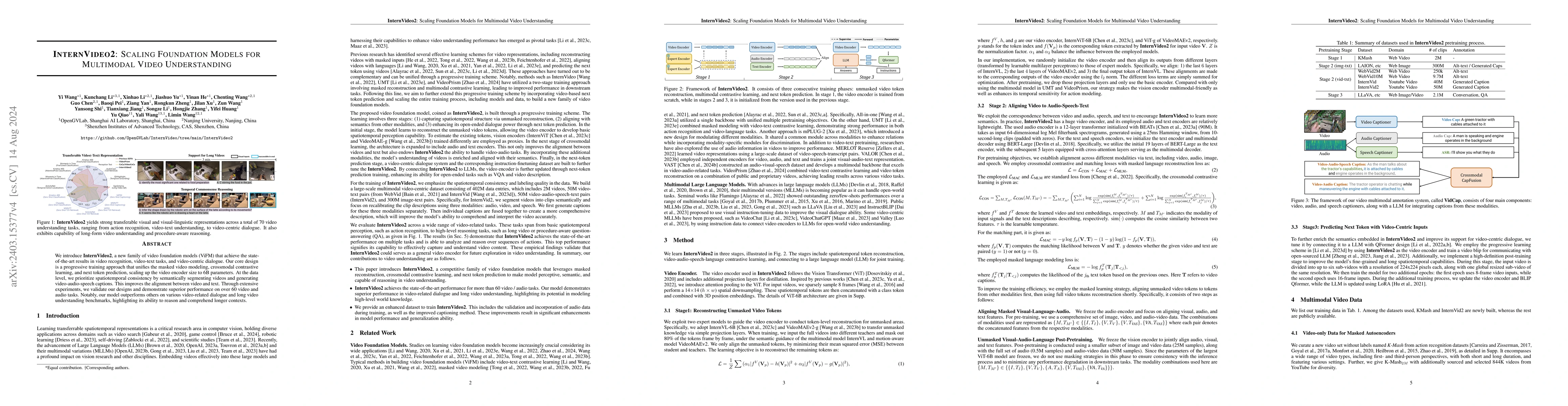 InternVideo2 is a state-of-the-art video foundation model that employs a progressive training approach to excel in action recognition and multimodal video tasks. It scales data and model size while prioritizing spatiotemporal consistency to achieve top performance on over 60 video and audio benchmarks.