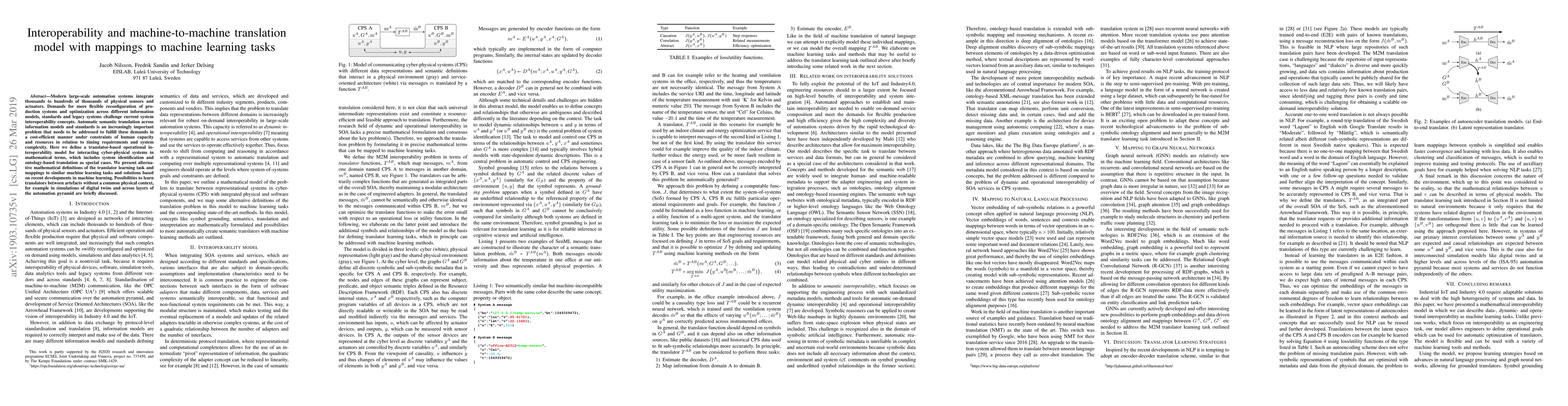 Modern large-scale automation systems integrate thousands to hundreds of thousands of physical sensors and actuators. Demands for more flexible reconfiguration of production systems and optimization across different information models, standards and legacy systems challenge current system interoperability concepts. Automatic semantic translation across information models and standards is an increasingly important problem that needs to be addressed to fulfill these demands in a cost-efficient manner under constraints of human capacity and resources in relation to timing requirements and system complexity. Here we define a translator-based operational interoperability model for interacting cyber-physical systems in mathematical terms, which includes system identification and ontology-based translation as special cases. We present alternative mathematical definitions of the translator learning task and mappings to similar machine learning tasks and solutions based on recent developments in machine learning. Possibilities to learn translators between artefacts without a common physical context, for example in simulations of digital twins and across layers of the automation pyramid are briefly discussed.