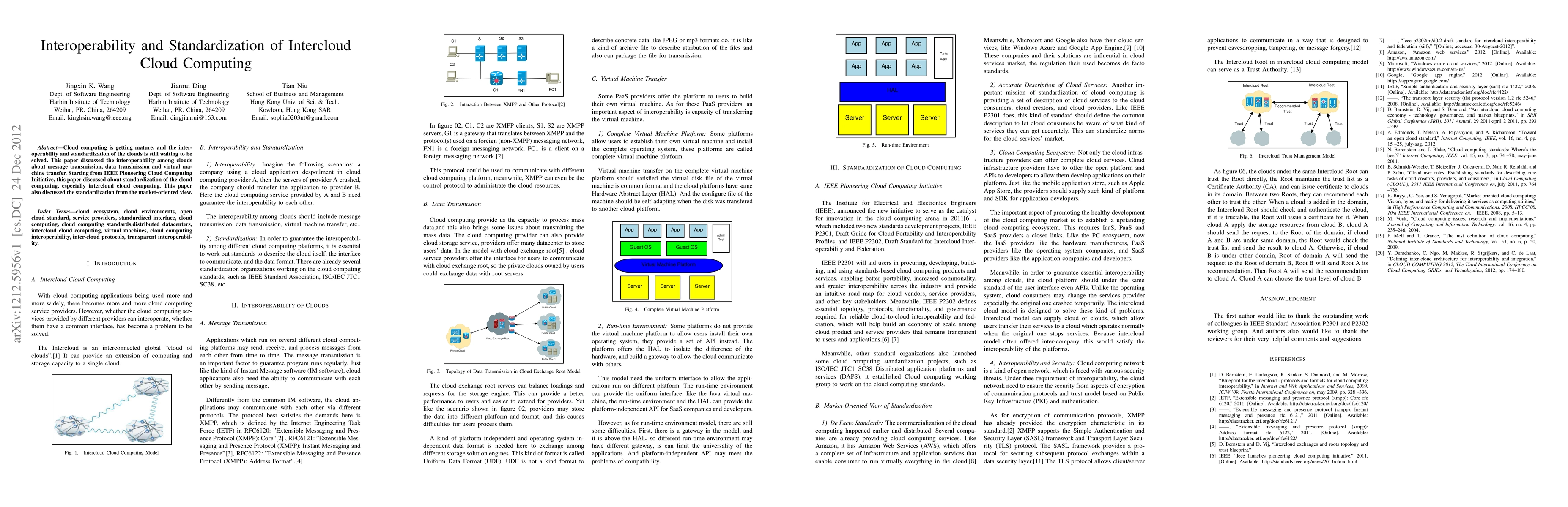 This paper explores the challenges of interoperability and standardization in intercloud cloud computing, focusing on message, data, and virtual machine transfers. It examines standardization efforts from the IEEE Pioneering Cloud Computing Initiative and discusses market-oriented approaches to intercloud standardization.