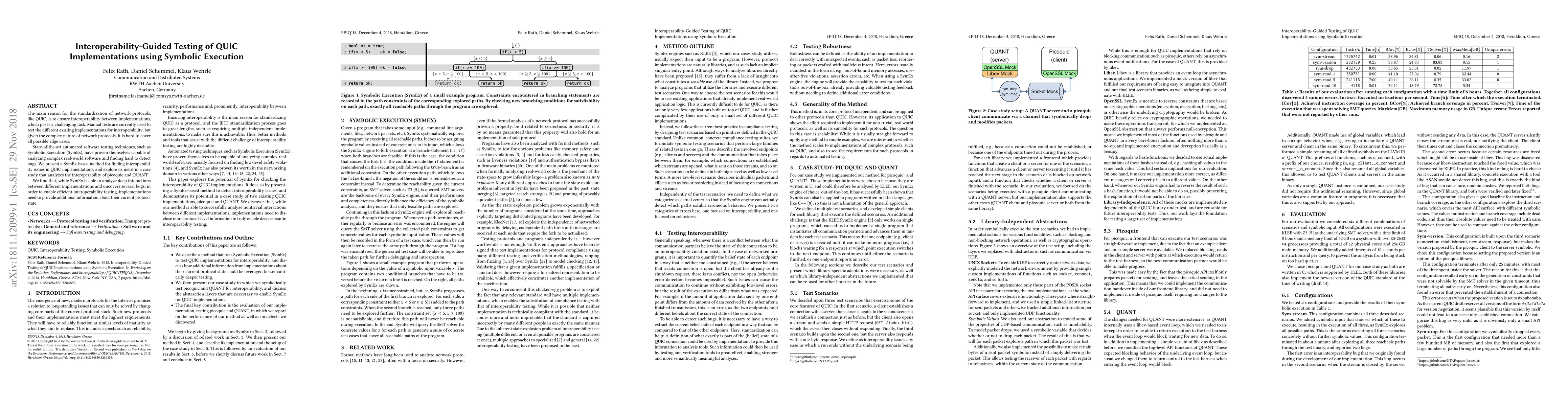 This paper proposes a Symbolic Execution-based method for testing QUIC protocol implementations to ensure interoperability, demonstrating its effectiveness through a case study comparing picoquic and QUANT. While the method uncovers several bugs, it highlights the need for implementations to provide additional protocol state information for efficient testing.