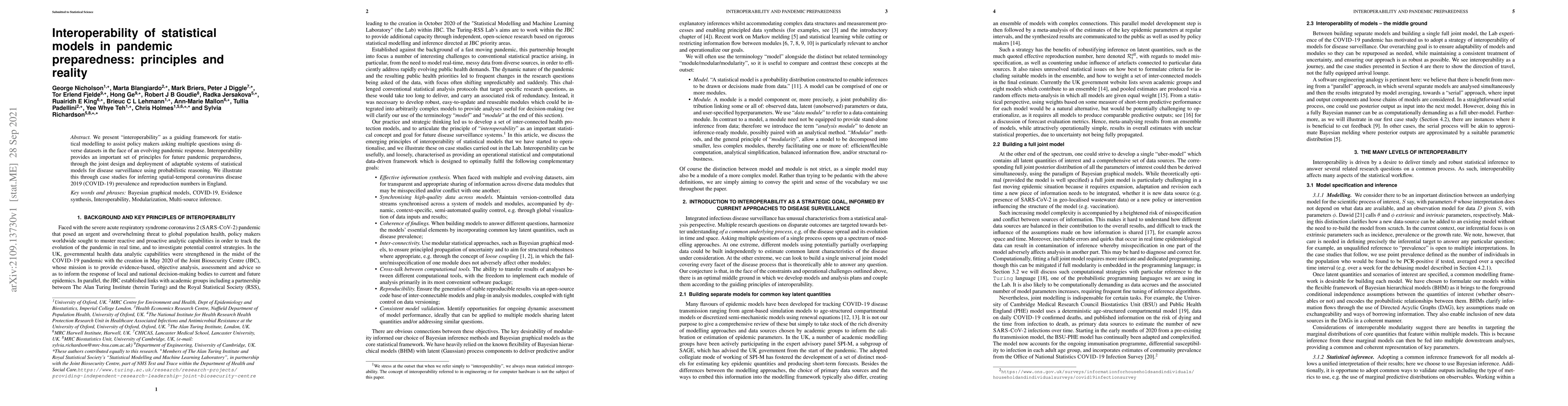 We present "interoperability" as a guiding framework for statistical modelling to assist policy makers asking multiple questions using diverse datasets in the face of an evolving pandemic response. Interoperability provides an important set of principles for future pandemic preparedness, through the joint design and deployment of adaptable systems of statistical models for disease surveillance using probabilistic reasoning. We illustrate this through case studies for inferring spatial-temporal coronavirus disease 2019 (COVID-19) prevalence and reproduction numbers in England.