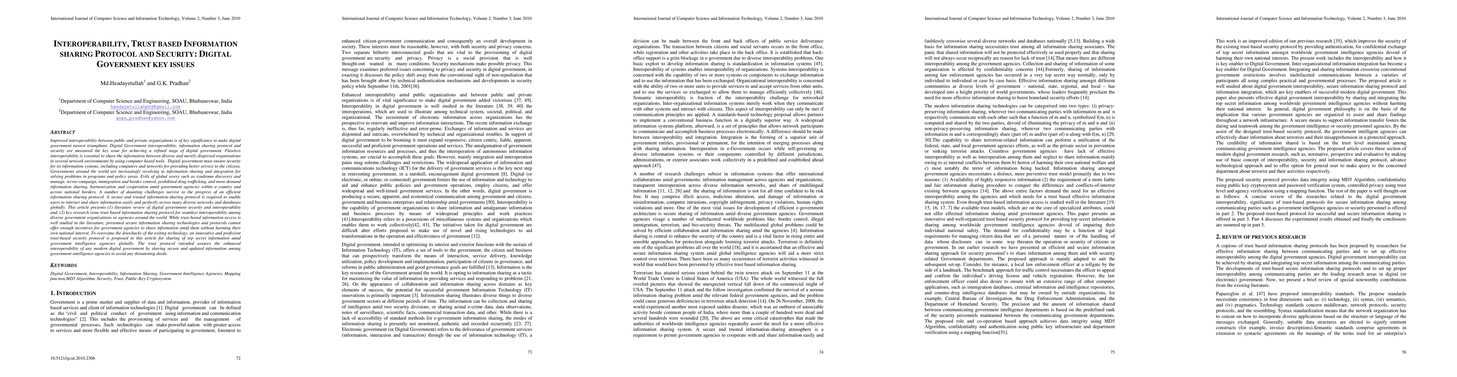 Improved interoperability between public and private organizations is of key significance to make digital government newest triumphant. Digital Government interoperability, information sharing protocol and security are measured the key issue for achieving a refined stage of digital government. Flawless interoperability is essential to share the information between diverse and merely dispersed organisations in several network environments by using computer based tools. Digital government must ensure security for its information systems, including computers and networks for providing better service to the citizens. Governments around the world are increasingly revolving to information sharing and integration for solving problems in programs and policy areas. Evils of global worry such as syndrome discovery and manage, terror campaign, immigration and border control, prohibited drug trafficking, and more demand information sharing, harmonization and cooperation amid government agencies within a country and across national borders. A number of daunting challenges survive to the progress of an efficient information sharing protocol. A secure and trusted information-sharing protocol is required to enable users to interact and share information easily and perfectly across many diverse networks and databases globally.
