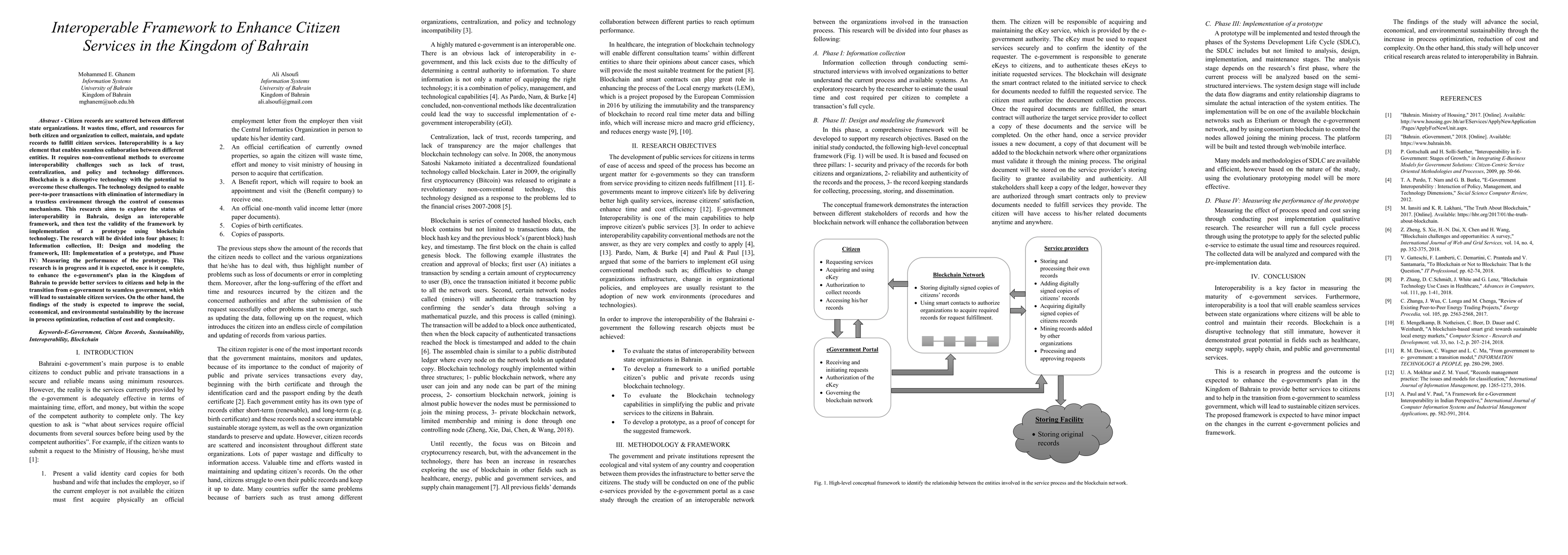Citizen records are scattered between different state organizations. It wastes time, effort, and resources for both citizen and organization to collect, maintain, and update records to fulfill citizen services. Interoperability is a key element that enables seamless collaboration between different entities. It requires non-conventional methods to overcome interoperability challenges such as lack of trust, centralization, and policy and technology differences. Blockchain is a disruptive technology with the potential to overcome these challenges. The technology designed to enable peer-to-peer transactions with elimination of intermediary in a trustless environment through the control of consensus mechanisms. This research aims to explore the status of interoperability in Bahrain, design an interoperable framework, and then test the validity of the framework by implementation of a prototype using blockchain technology. The research will be divided into four phases; I: Information collection, II: Design and modeling the framework, III: Implementation of a prototype, and Phase IV: Measuring the performance of the prototype. This research is in progress and it is expected, once is it complete, to enhance the e-government's plan in the Kingdom of Bahrain to provide better services to citizens and help in the transition from e-government to seamless government, which will lead to sustainable citizen services. On the other hand, the findings of the study is expected to improve the social, economical, and environmental sustainability by the increase in process optimization, reduction of cost and complexity.