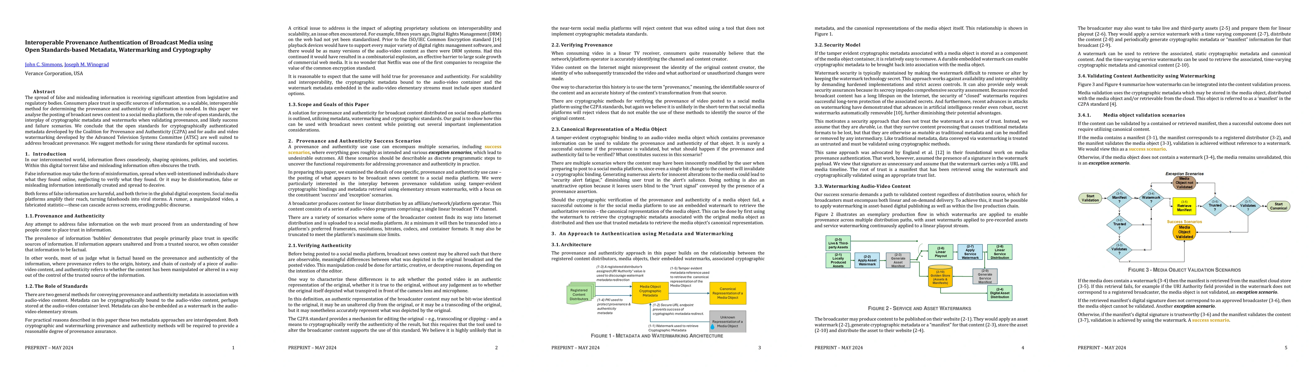This paper explores the use of open standards-based metadata, watermarking, and cryptography to authenticate the provenance of broadcast media on social platforms. It concludes that the C2PA and ATSC standards provide a scalable, interoperable solution for validating the authenticity of broadcast news content, with suggested methods for optimal implementation.