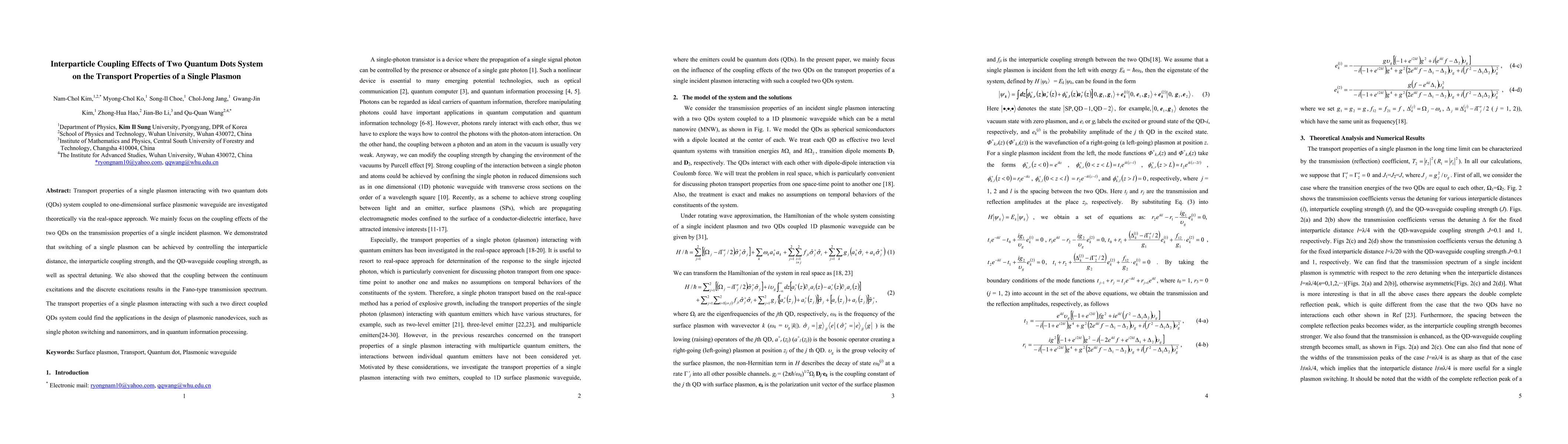 This paper investigates the transport properties of a single plasmon interacting with a system of two coupled quantum dots on a surface plasmonic waveguide. The study reveals that the transmission characteristics can be controlled by adjusting interparticle distance, coupling strength, and spectral detuning, leading to Fano-type transmission spectra and potential applications in nanodevices and quantum information processing.