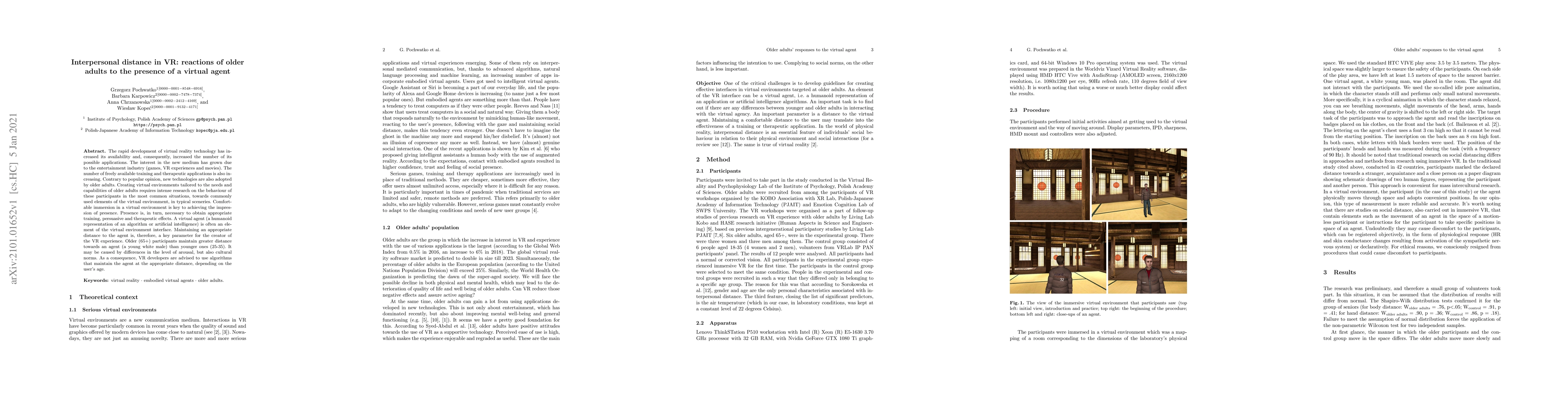 The rapid development of virtual reality technology has increased its availability and, consequently, increased the number of its possible applications. The interest in the new medium has grown due to the entertainment industry (games, VR experiences and movies). The number of freely available training and therapeutic applications is also increasing. Contrary to popular opinion, new technologies are also adopted by older adults. Creating virtual environments tailored to the needs and capabilities of older adults requires intense research on the behaviour of these participants in the most common situations, towards commonly used elements of the virtual environment, in typical sceneries. Comfortable immersion in a virtual environment is key to achieving the impression of presence. Presence is, in turn, necessary to obtain appropriate training, persuasive and therapeutic effects. A virtual agent (a humanoid representation of an algorithm or artificial intelligence) is often an element of the virtual environment interface. Maintaining an appropriate distance to the agent is, therefore, a key parameter for the creator of the VR experience. Older (65+) participants maintain greater distance towards an agent (a young white male) than younger ones (25-35). It may be caused by differences in the level of arousal, but also cultural norms. As a consequence, VR developers are advised to use algorithms that maintain the agent at the appropriate distance, depending on the user's age.