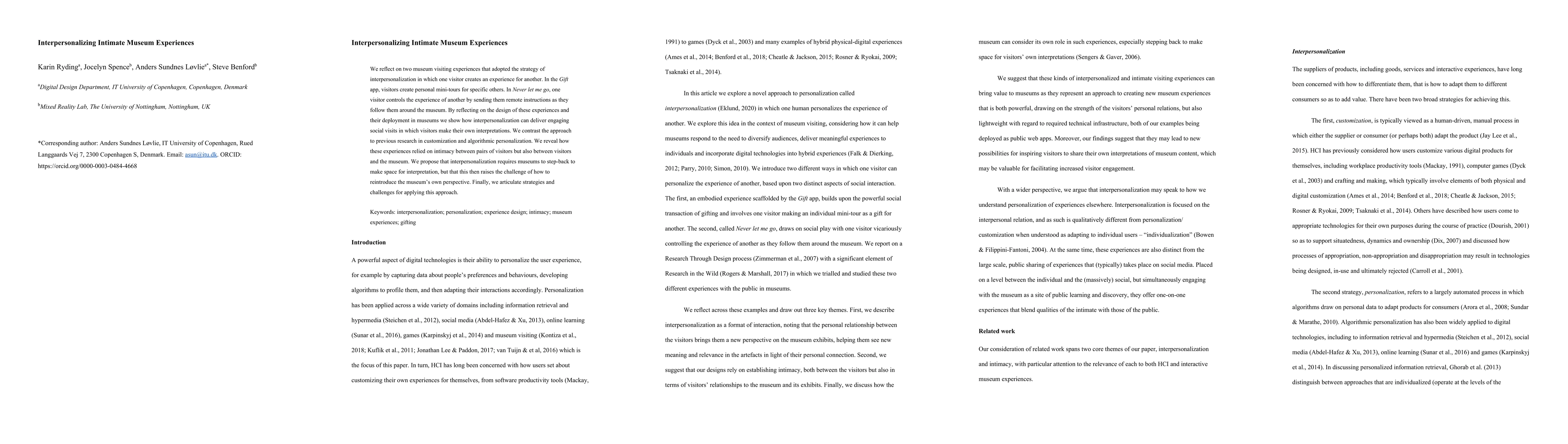 We reflect on two museum visiting experiences that adopted the strategy of interpersonalization in which one visitor creates an experience for another. In the Gift app, visitors create personal mini-tours for specific others. In Never let me go, one visitor controls the experience of another by sending them remote instructions as they follow them around the museum. By reflecting on the design of these experiences and their deployment in museums we show how interpersonalization can deliver engaging social visits in which visitors make their own interpretations. We contrast the approach to previous research in customization and algorithmic personalization. We reveal how these experiences relied on intimacy between pairs of visitors but also between visitors and the museum. We propose that interpersonalization requires museums to step back to make space for interpretation, but that this then raises the challenge of how to reintroduce the museum's own perspective. Finally, we articulate strategies and challenges for applying this approach.