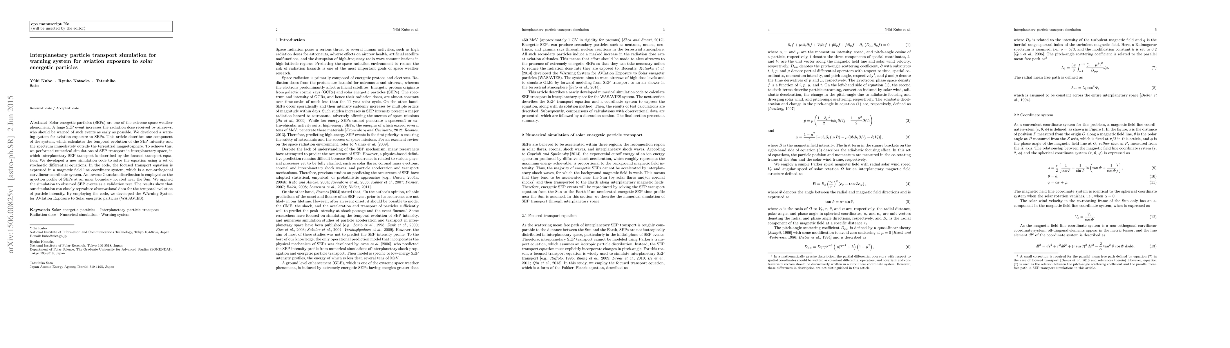 This paper presents a simulation code for modeling the transport of solar energetic particles (SEPs) in interplanetary space to predict SEP intensity and spectrum near Earth, crucial for developing a warning system (WASAVIES) for aviation exposure. The code employs a focused transport equation and stochastic differential equations to simulate SEPs in a magnetic field line coordinate system.