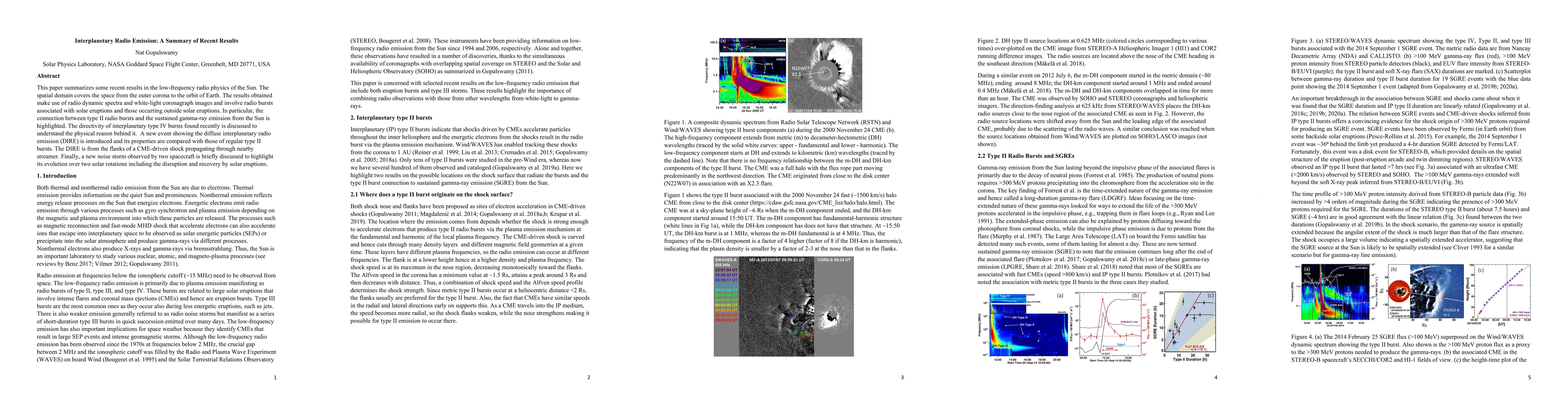 This paper reviews recent findings on solar low-frequency radio emissions, utilizing dynamic spectra and coronagraph images. It highlights links between type II bursts and gamma-ray emissions, discusses the directivity of type IV bursts, introduces a new diffuse interplanetary radio emission (DIRE) event, and examines a noise storm observed by two spacecraft over two solar rotations.