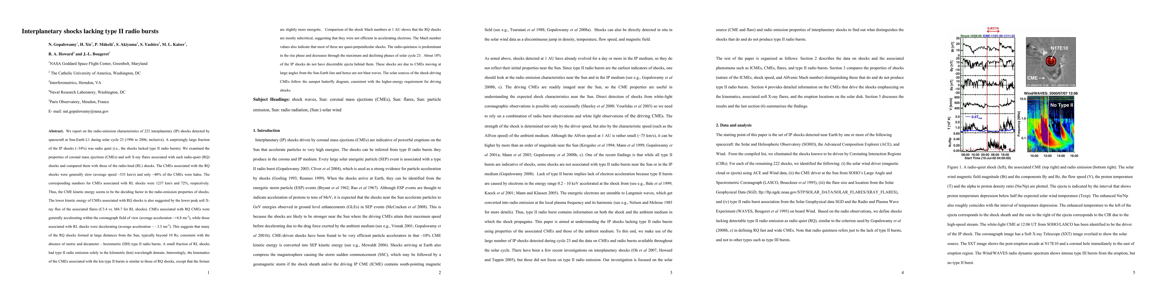 This study finds that 34% of interplanetary shocks lack type II radio bursts, indicating they are radio quiet. These radio-quiet shocks are associated with slower, less energetic coronal mass ejections (CMEs) and show lower soft X-ray flux compared to radio-loud shocks.