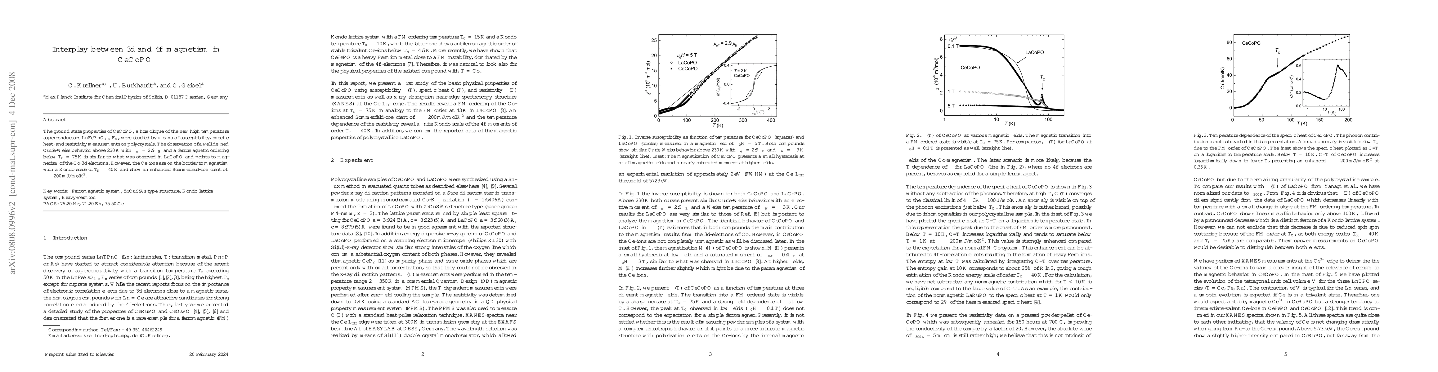 The paper investigates CeCoPO, a material that exhibits 3d and 4f magnetism, with key findings including Curie-Weiss behavior above 230K and ferromagnetic ordering below 75K.