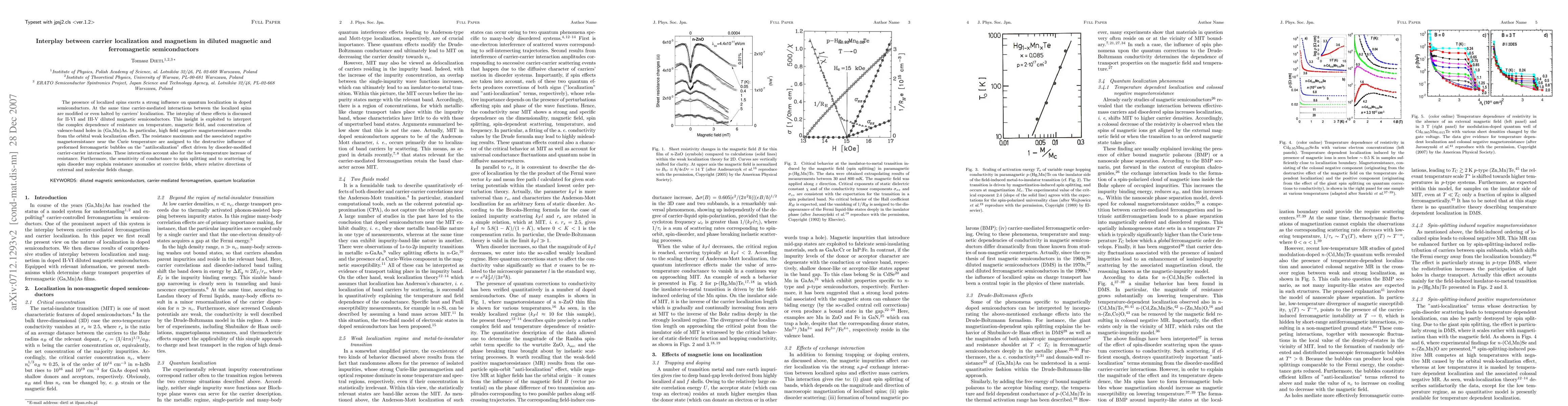 This paper investigates the complex interactions between carrier localization and magnetism in diluted magnetic semiconductors, focusing on II-VI and III-V compounds. It explains how localized spins affect quantum localization and how carrier localization modifies spin interactions, leading to phenomena like high field negative magnetoresistance and resistance anomalies at coercive fields.