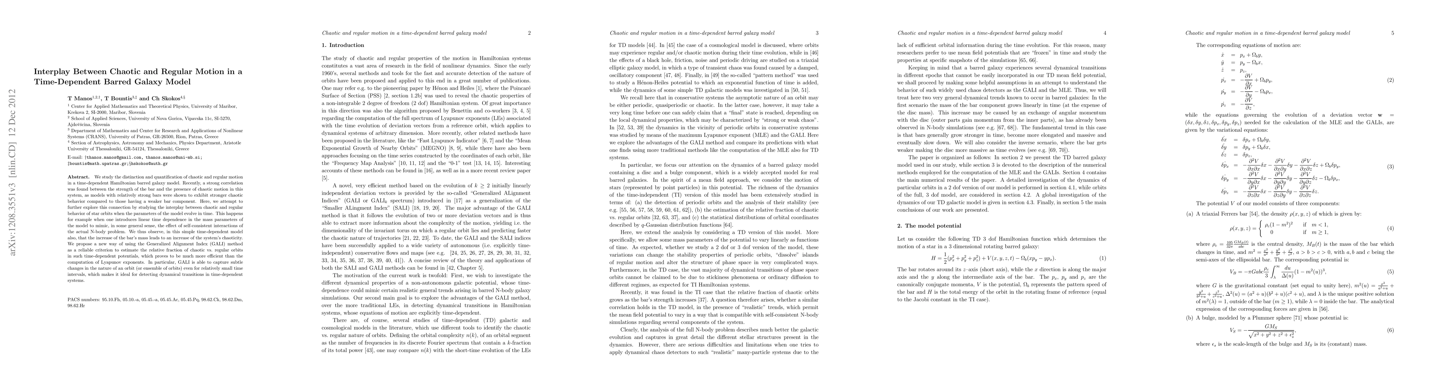 This paper investigates the dynamics of a time-dependent barred galaxy model, focusing on the interplay between chaotic and regular star orbits. It finds that increasing the bar's mass enhances the system's chaoticity, and introduces the Generalized Alignment Index (GALI) as a more efficient method than Lyapunov exponents for estimating the relative fraction of chaotic vs. regular orbits in such systems.