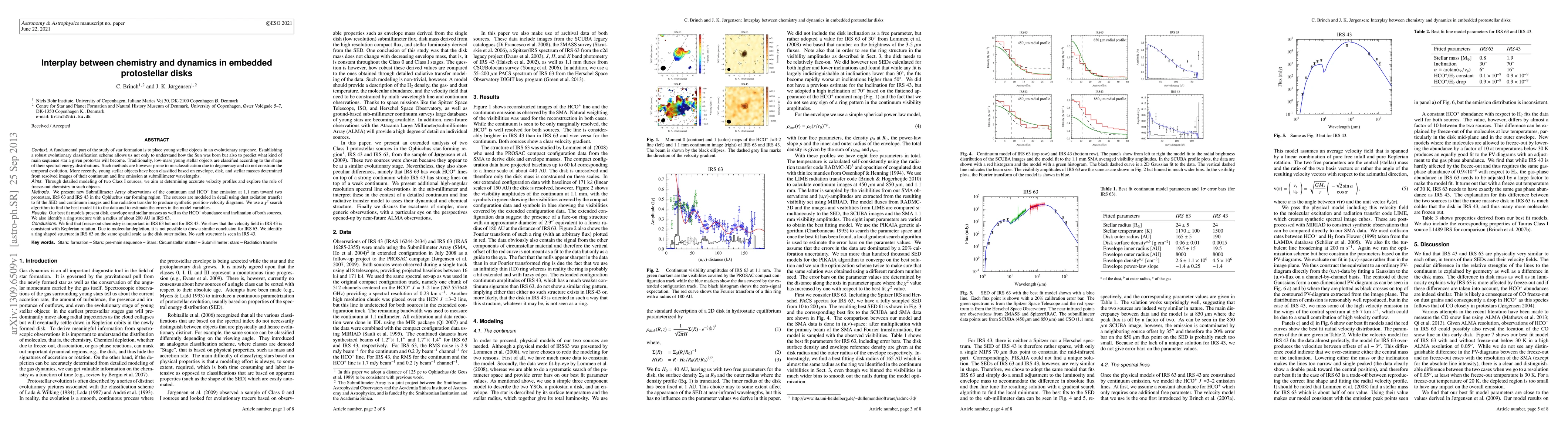 A fundamental part of the study of star formation is to place young stellar objects in an evolutionary sequence. Establishing a robust evolutionary classification scheme allows us not only to understand how the Sun was born but also to predict what kind of main sequence star a given protostar will become. Traditionally, low-mass young stellar objects are classified according to the shape of their SEDs. Such methods are however prone to misclassification due to degeneracy and do not constrain the temporal evolution. More recently, young stellar objects have been classified based on envelope, disk, and stellar masses determined from resolved images of their continuum and line emission at submillimeter wavelengths. Through detailed modeling of two Class I sources, we aim at determining accurate velocity profiles and explore the role of freeze-out chemistry in such objects. We present new Submillimeter Array observations of the continuum and HCO$^+$ line emission at 1.1 mm toward two protostars, IRS 63 and IRS 43 in the Ophiuchus star forming region. The sources are modeled in detail using dust radiation transfer to fit the SED and continuum images and line radiation transfer to produce synthetic position-velocity diagrams. We use a $\chi^2$ search algorithm to find the best model fit to the data and to estimate the errors in the model variables. Our best fit models present disk, envelope and stellar masses as well as the HCO$^+$ abundance and inclination of both sources. We also identify a ring structure with a radius of about 200 AU in IRS 63. We find that freeze-out chemistry is important in IRS 63 but not for IRS 43. We show that the velocity field in IRS 43 is consistent with Keplerian rotation. Due to molecular depletion, it is not possible to draw a similar conclusion for IRS 63. We identify a ring shaped structure in IRS 63 on the same spatial scale as the disk outer radius.