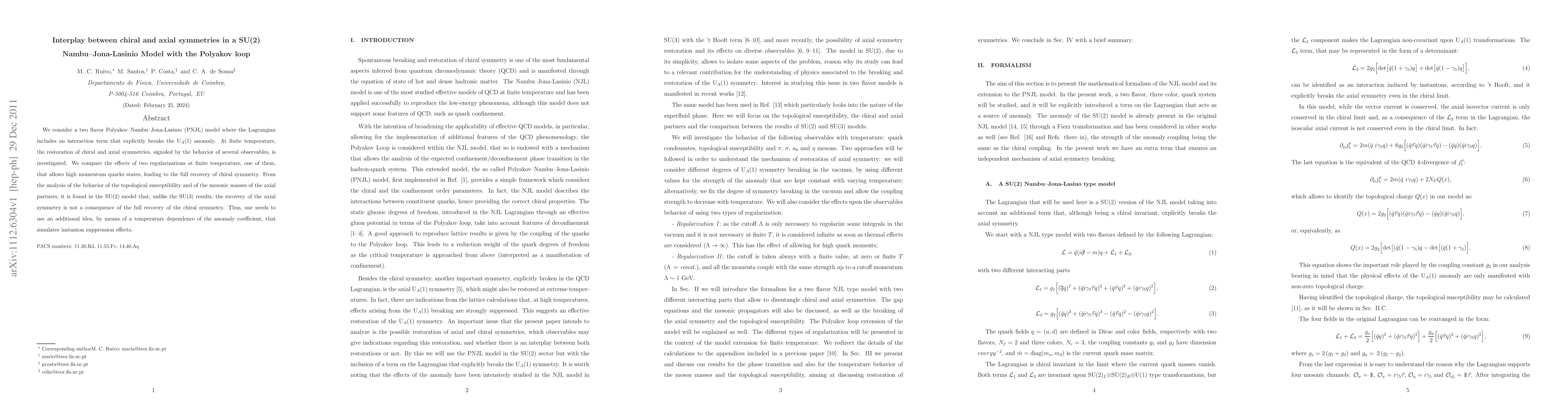 We consider a two flavor Polyakov--Nambu--Jona-Lasinio (PNJL) model where the Lagrangian includes an interaction term that explicitly breaks the U$_A(1)$ anomaly. At finite temperature, the restoration of chiral and axial symmetries, signaled by the behavior of several observables, is investigated. We compare the effects of two regularizations at finite temperature, one of them, that allows high momentum quarks states, leading to the full recovery of chiral symmetry. From the analysis of the behavior of the topological susceptibility and of the mesonic masses of the axial partners, it is found in the SU(2) model that, unlike the SU(3) results, the recovery of the axial symmetry is not a consequence of the full recovery of the chiral symmetry. Thus, one needs to use an additional idea, by means of a temperature dependence of the anomaly coefficient, that simulates instanton suppression effects.