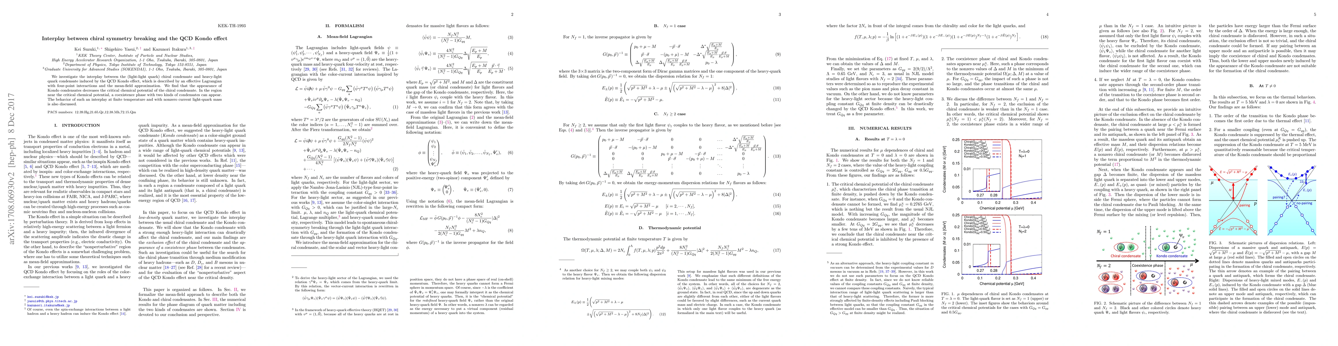 We investigate the interplay between the (light-light quark) chiral condensate and heavy-light quark condensate induced by the QCD Kondo effect, which is described by an effective Lagrangian with four-point interactions and the mean-field approximation. We find that the appearance of Kondo condensates decreases the critical chemical potential of the chiral condensate. In the region near the critical chemical potential, a coexistence phase with two kinds of condensates can appear. The behavior of such an interplay at finite temperature and with nonzero current light-quark mass is also discussed.