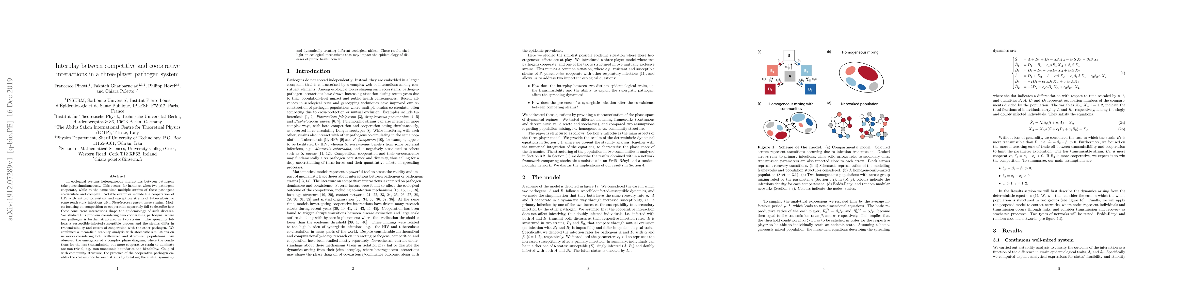 This research explores the simultaneous competitive and cooperative interactions among three pathogens, focusing on how these dynamics influence disease spread. The study reveals complex conditions under which a less transmissible but more cooperative pathogen strain can dominate, highlighting the role of community structure and ecological niches in shaping disease epidemiology.