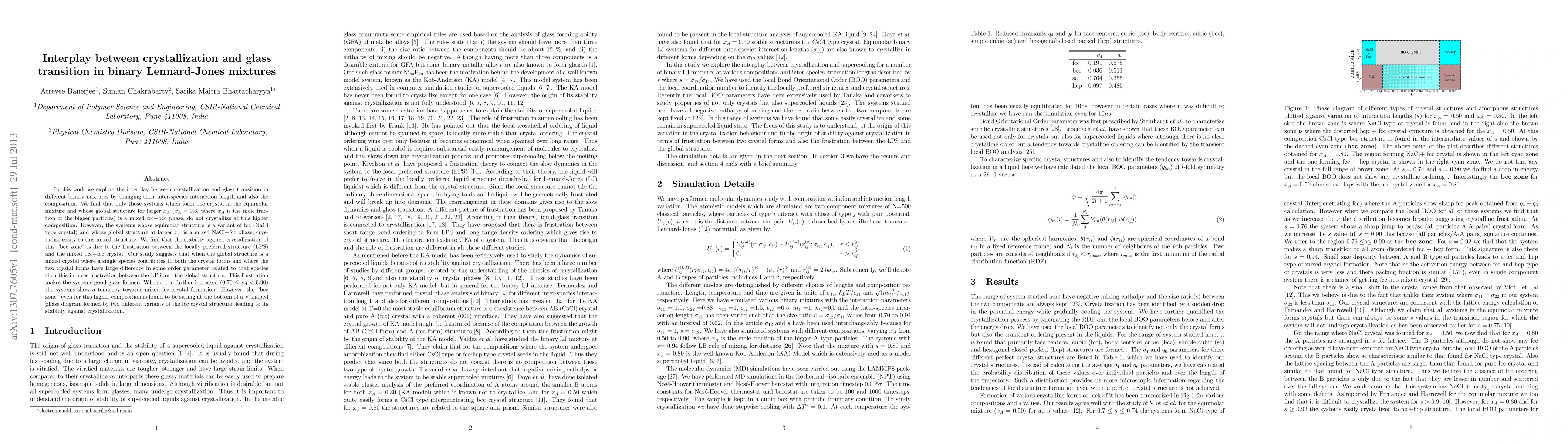 In this work we explore the interplay between crystallization and glass transition in different binary mixtures by changing their inter-species interaction length and also the composition. We find that only those systems which form bcc crystal in the equimolar mixture and whose global structure for larger $x_A$ ($x_A=0.6$, where $x_A$ is the mole fraction of the bigger particles) is a mixed fcc+bcc phase, do not crystallize at this higher composition. However, the systems whose equimolar structure is a variant of fcc (NaCl type crystal) and whose global structure at larger $x_A$ is a mixed NaCl+fcc phase, crystallize easily to this mixed structure. We find that the stability against crystallization of this "bcc zone" is due to the frustration between the locally preferred structure (LPS) and the mixed bcc+fcc crystal. Our study suggests that when the global structure is a mixed crystal where a single species contributes to both the crystal forms and where the two crystal forms have large difference in some order parameter related to that species then this induces frustration between the LPS and the global structure. This frustration makes the systems good glass former. When $x_A$ is further increased ($0.70\leq x_A < 0.90$) the systems show a tendency towards mixed fcc crystal formation. However, the "bcc zone" even for this higher composition is found to be sitting at the bottom of a V shaped phase diagram formed by two different variants of the fcc crystal structure, leading to its stability against crystallization.