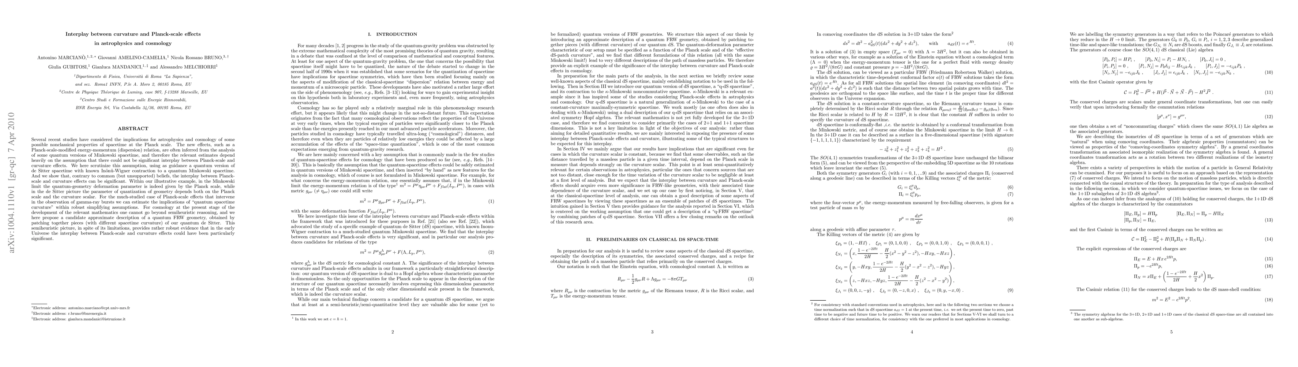 Several recent studies have considered the implications for astrophysics and cosmology of some possible nonclassical properties of spacetime at the Planck scale. The new effects, such as a Planck-scale-modified energy-momentum (dispersion) relation, are often inferred from the analysis of some quantum versions of Minkowski spacetime, and therefore the relevant estimates depend heavily on the assumption that there could not be significant interplay between Planck-scale and curvature effects. We here scrutinize this assumption, using as guidance a quantum version of de Sitter spacetime with known Inonu-Wigner contraction to a quantum Minkowski spacetime. And we show that, contrary to common (but unsupported) beliefs, the interplay between Planck-scale and curvature effects can be significant. Within our illustrative example, in the Minkowski limit the quantum-geometry deformation parameter is indeed given by the Planck scale, while in the de Sitter picture the parameter of quantization of geometry depends both on the Planck scale and the curvature scalar. For the much-studied case of Planck-scale effects that intervene in the observation of gamma-ray bursts we can estimate the implications of "quantum spacetime curvature" within robust simplifying assumptions. For cosmology at the present stage of the development of the relevant mathematics one cannot go beyond semiheuristic reasoning, and we here propose a candidate approximate description of a quantum FRW geometry, obtained by patching together pieces (with different spacetime curvature) of our quantum de Sitter. This semiheuristic picture, in spite of its limitations, provides rather robust evidence that in the early Universe the interplay between Planck-scale and curvature effects could have been particularly significant.