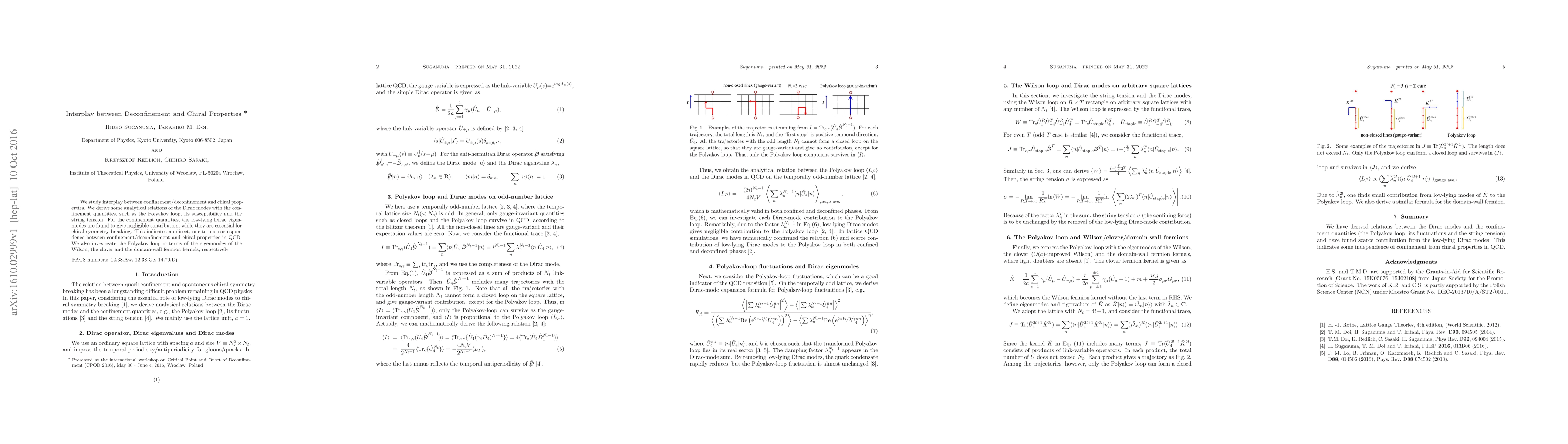 We study interplay between confinement/deconfinement and chiral properties. We derive some analytical relations of the Dirac modes with the confinement quantities, such as the Polyakov loop, its susceptibility and the string tension. For the confinement quantities, the low-lying Dirac eigenmodes are found to give negligible contribution, while they are essential for chiral symmetry breaking. This indicates no direct, one-to-one correspondence between confinement/deconfinement and chiral properties in QCD. We also investigate the Polyakov loop in terms of the eigenmodes of the Wilson, the clover and the domain-wall fermion kernels, respectively.