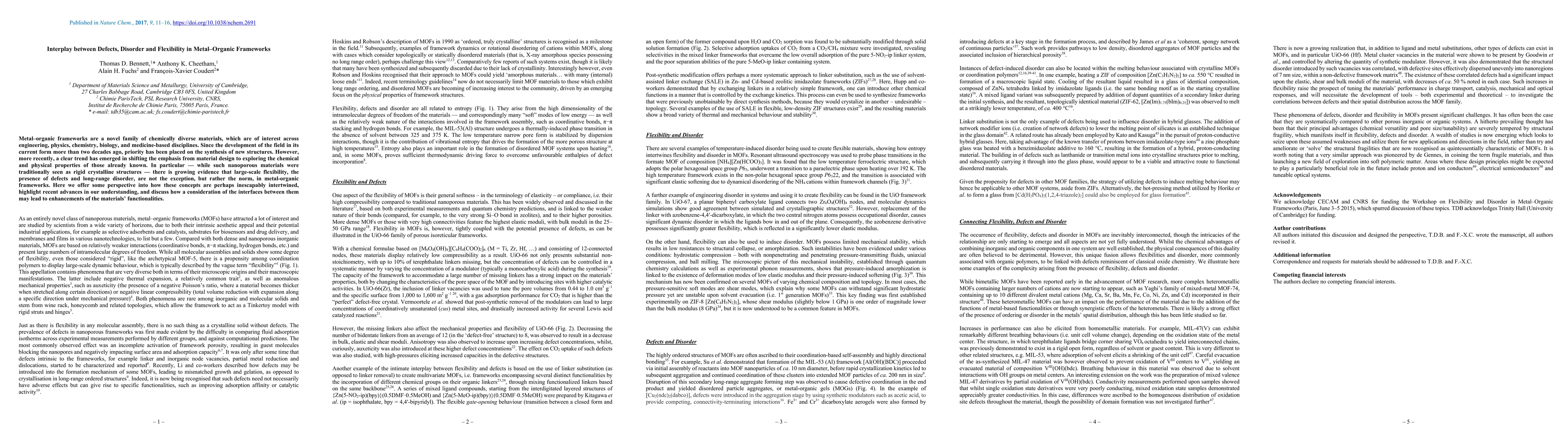 This paper explores the interplay between defects, disorder, and flexibility in metal-organic frameworks (MOFs), highlighting recent advances in understanding how these properties are interconnected and how they can enhance the functionalities of MOFs. It emphasizes that flexibility, defects, and disorder are common traits in MOFs, contrary to their traditional view as rigid structures.
