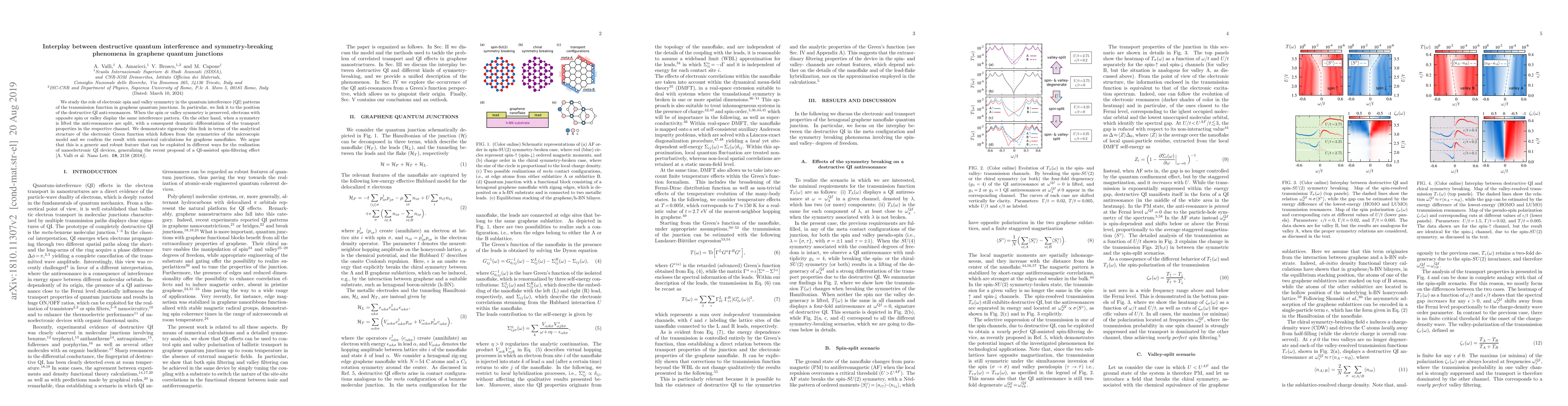 We study the role of electronic spin and valley symmetry in the quantum interference (QI) patterns of the transmission function in graphene quantum junctions. In particular, we link it to the position of the destructive QI anti-resonances. When the spin or valley symmetry is preserved, electrons with opposite spin or valley display the same interference pattern. On the other hand, when a symmetry is lifted the anti-resonances are split, with a consequent dramatic differentiation of the transport properties in the respective channel. We demonstrate rigorously this link in terms of the analytical structure of the electronic Green function which follows from the symmetries of the microscopic model and we confirm the result with numerical calculations for graphene nanoflakes. We argue that this is a generic and robust feature that can be exploited in different ways for the realization of nanoelectronic QI devices, generalizing the recent proposal of a QI-assisted spin-filtering effect [A. Valli et al. Nano Lett. 18, 2158 (2018)].