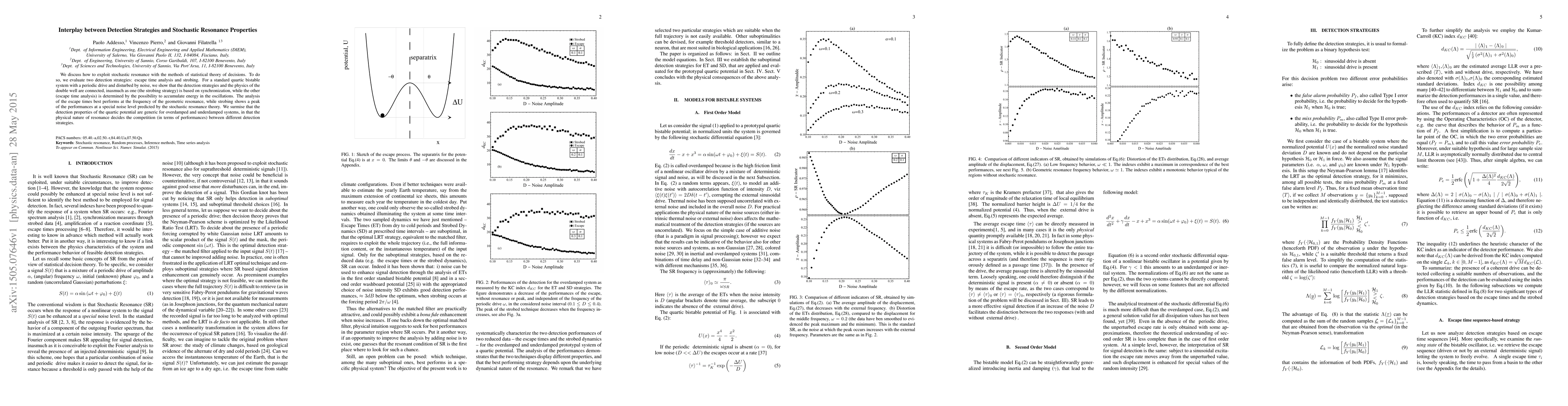 We discuss how to exploit stochastic resonance with the methods of statistical theory of decisions. To do so, we evaluate two detection strategies: escape time analysis and strobing. For a standard quartic bistable system with a periodic drive and disturbed by noise, we show that the detection strategies and the physics of the double well are connected, inasmuch as one (the strobing strategy) is based on synchronization, while the other (escape time analysis) is determined by the possibility to accumulate energy in the oscillations. The analysis of the escape times best performs at the frequency of the geometric resonance, while strobing shows a peak of the performances at a special noise level predicted by the stochastic resonance theory. We surmise that the detection properties of the quartic potential are generic for overdamped and underdamped systems, in that the physical nature of resonance decides the competition (in terms of performances) between different detection strategies.