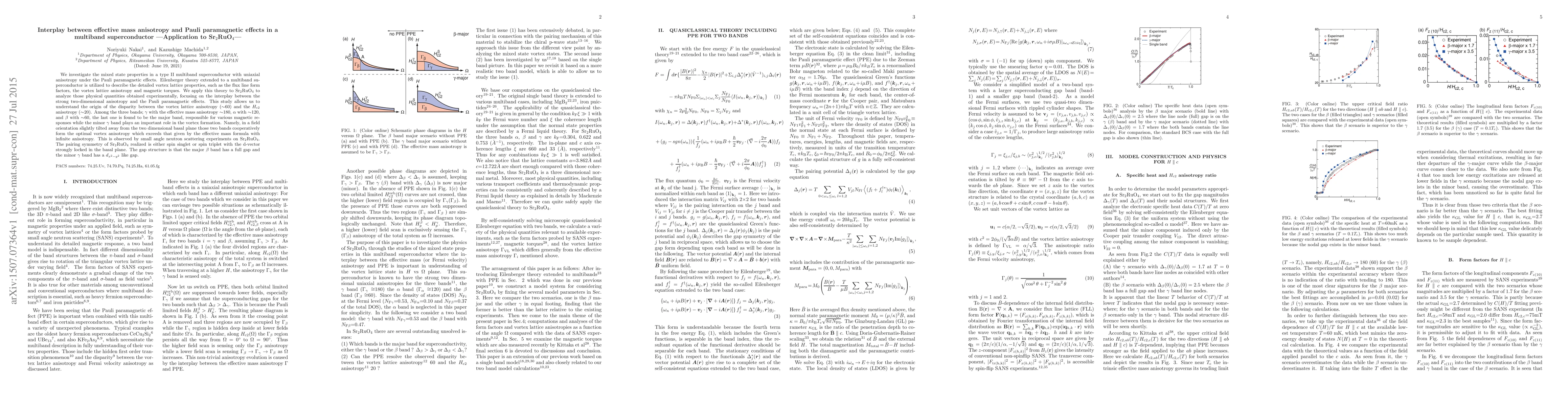 We investigate the mixed state properties in a type II multiband superconductor with uniaxial anisotropy under the Pauli paramagnetic effects. Eilenberger theory extended to a multiband superconductor is utilized to describe the detailed vortex lattice properties, such as the flux line form factors, the vortex lattice anisotropy and magnetic torques. We apply this theory to Sr$_2$RuO$_4$ to analyze those physical quantities obtained experimentally, focusing on the interplay between the strong two-dimensional anisotropy and the Pauli paramagnetic effects. This study allows us to understand the origin of the disparity between the vortex lattice anisotropy ($\sim$60) and the $H_{\rm c2}$ anisotropy ($\sim$20). Among the three bands; $\gamma$ with the effective mass anisotropy $\sim$180, $\alpha$ with $\sim$120, and $\beta$ with $\sim$60, the last one is found to be the major band, responsible for various magnetic responses while the minor $\gamma$ band plays an important role in the vortex formation. Namely, in a field orientation slightly tilted away from the two dimensional basal plane those two bands cooperatively form the optimal vortex anisotropy which exceeds that given by the effective mass formula with infinite anisotropy. This is observed by small angle neutron scattering experiments on Sr$_2$RuO$_4$. The pairing symmetry of Sr$_2$RuO$_4$ realized is either spin singlet or spin triplet with the d-vector strongly locked in the basal plane. The gap structure is that the major $\beta$ band has a full gap and the minor $\gamma$ band has a $d_{x^2-y^2}$ like gap.