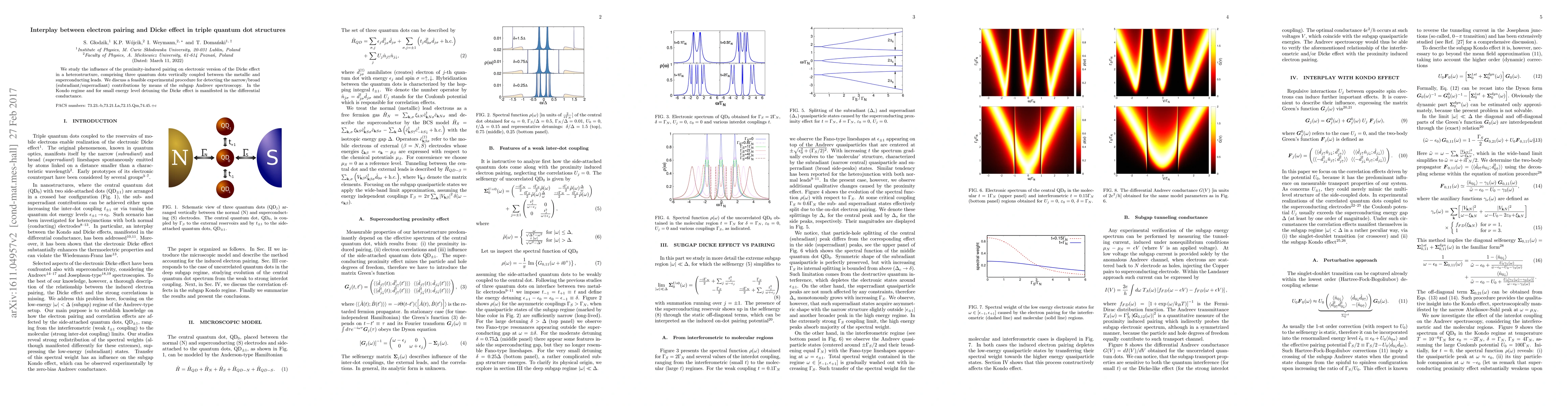 This paper investigates how proximity-induced electron pairing affects the Dicke effect in a triple quantum dot structure connected to metallic and superconducting leads, proposing a method for detecting subradiant/superradiant contributions via subgap Andreev spectroscopy, with the Dicke effect observable in differential conductance in the Kondo regime.