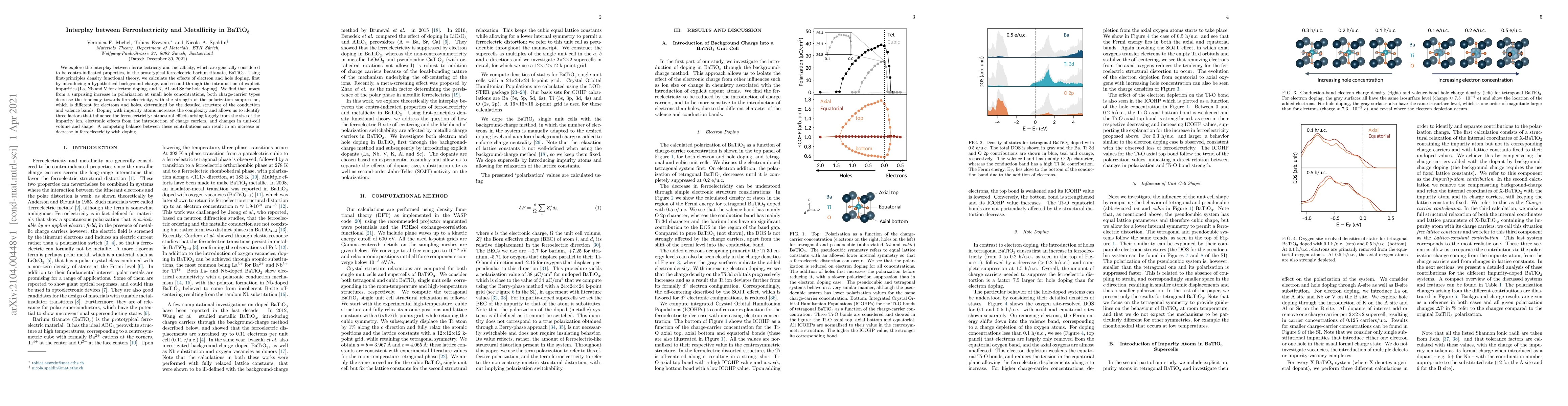 We explore the interplay between ferroelectricity and metallicity, which are generally considered to be contra-indicated properties, in the prototypical ferroelectric barium titanate, BaTiO$_3$. Using first-principles density functional theory, we calculate the effects of electron and hole doping, first by introducing a hypothetical background charge, and second through the introduction of explicit impurities (La, Nb and V for electron doping, and K, Al and Sc for hole doping). We find that, apart from a surprising increase in polarization at small hole concentrations, both charge-carrier types decrease the tendency towards ferroelectricity, with the strength of the polarization suppression, which is different for electrons and holes, determined by the detailed structure of the conduction and valence bands. Doping with impurity atoms increases the complexity and allows us to identify three factors that influence the ferroelectricity: structural effects arising largely from the size of the impurity ion, electronic effects from the introduction of charge carriers, and changes in unit-cell volume and shape. A competing balance between these contributions can result in an increase or decrease in ferroelectricity with doping.