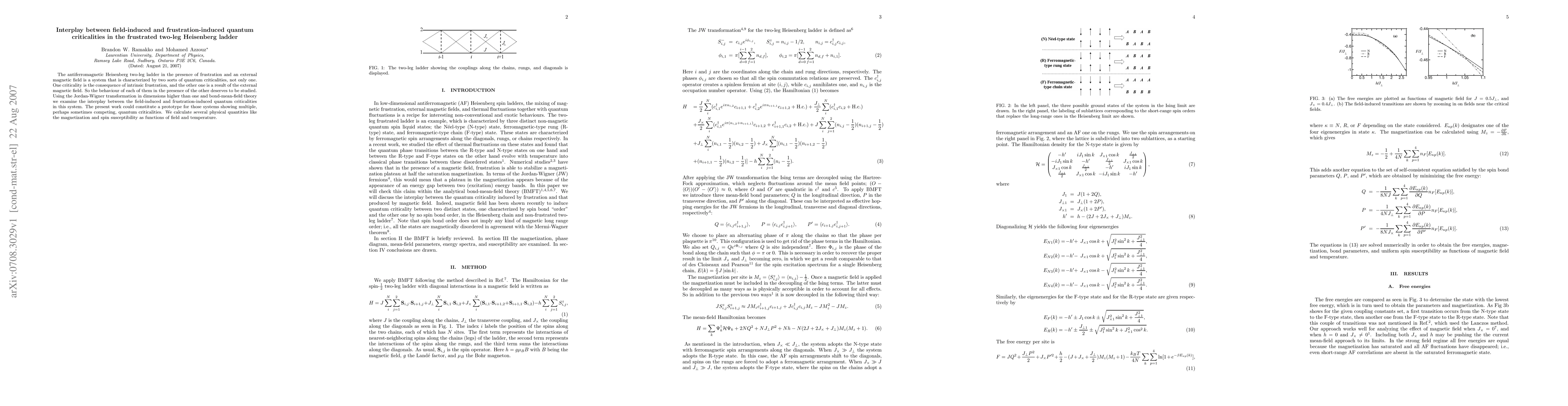 The antiferromagnetic Heisenberg two-leg ladder in the presence of frustration and an external magnetic field is a system that is characterized by two sorts of quantum criticalities, not only one. One criticality is the consequence of intrinsic frustration, and the other one is a result of the external magnetic field. So the behaviour of each of them in the presence of the other deserves to be studied. Using the Jordan-Wigner transformation in dimensions higher than one and bond-mean-field theory we examine the interplay between the field-induced and frustration-induced quantum criticalities in this system. The present work could constitute a prototype for those systems showing multiple, perhaps sometimes competing, quantum criticalities. We calculate several physical quantities like the magnetization and spin susceptibility as functions of field and temperature.