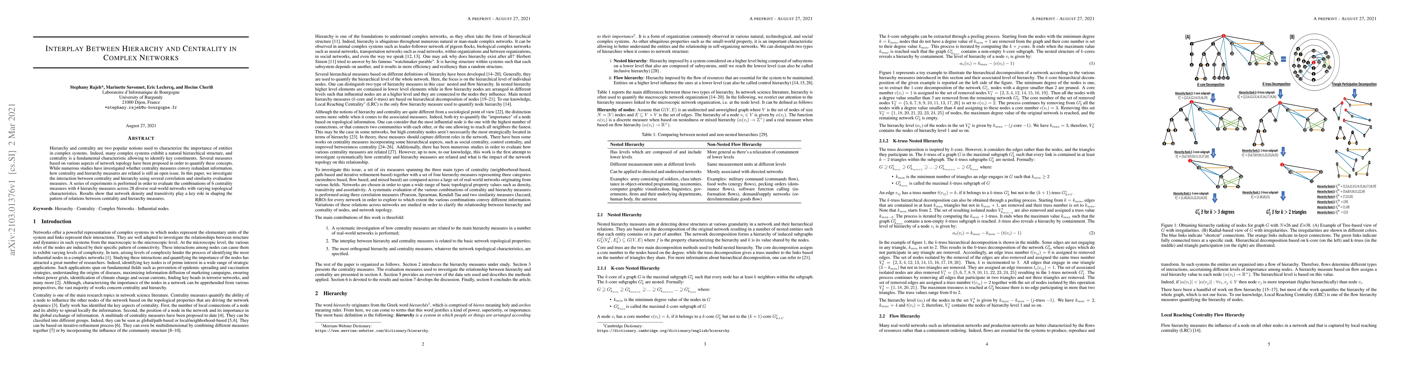 The paper presents a comprehensive analysis of the interplay between centrality and hierarchy measures using multiple evaluation measures and diverse real-world networks.