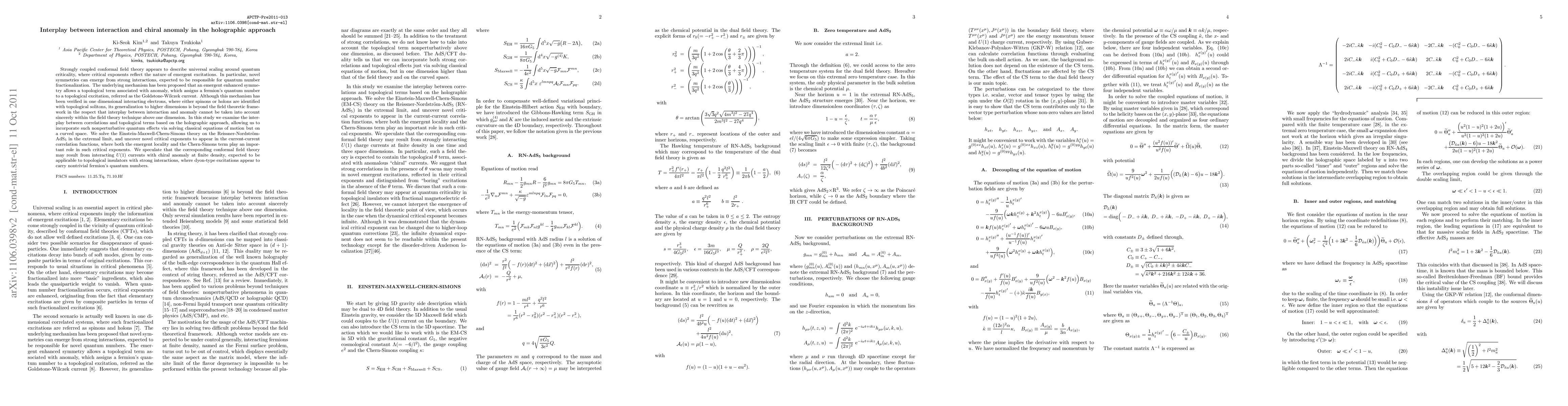 Strongly coupled conformal field theory appears to describe universal scaling around quantum criticality, where critical exponents reflect the nature of emergent excitations. In particular, novel symmetries can emerge from strong interactions, expected to be responsible for quantum number fractionalization. The underlying mechanism has been proposed that an emergent enhanced symmetry allows a topological term associated with anomaly, which assigns a fermion's quantum number to a topological excitation, referred as the Goldstone-Wilczek current. Although this mechanism has been verified in one dimensional interacting electrons, where either spinons or holons are identified with topological solitons, its generalization to higher dimensions is beyond the field theoretic framework in the respect that interplay between interaction and anomaly cannot be taken into account sincerely within the field theory technique above one dimension. In this study we examine the interplay between correlations and topological terms based on the holographic approach, allowing us to incorporate such nonperturbative quantum effects via solving classical equations of motion but on a curved space. We solve the Einstein-Maxwell-Chern-Simons theory on the Reissner-Nordstr\"om-AdS$_5$ in the extremal limit, and uncover novel critical exponents to appear in the current-current correlation functions, where both the emergent locality and the Chern-Simons term play an important role in such critical exponents. We speculate that the corresponding conformal field theory may result from interacting U(1) currents with chiral anomaly at finite density, expected to be applicable to topological insulators with strong interactions, where dyon-type excitations appear to carry nontrivial fermion's quantum numbers.