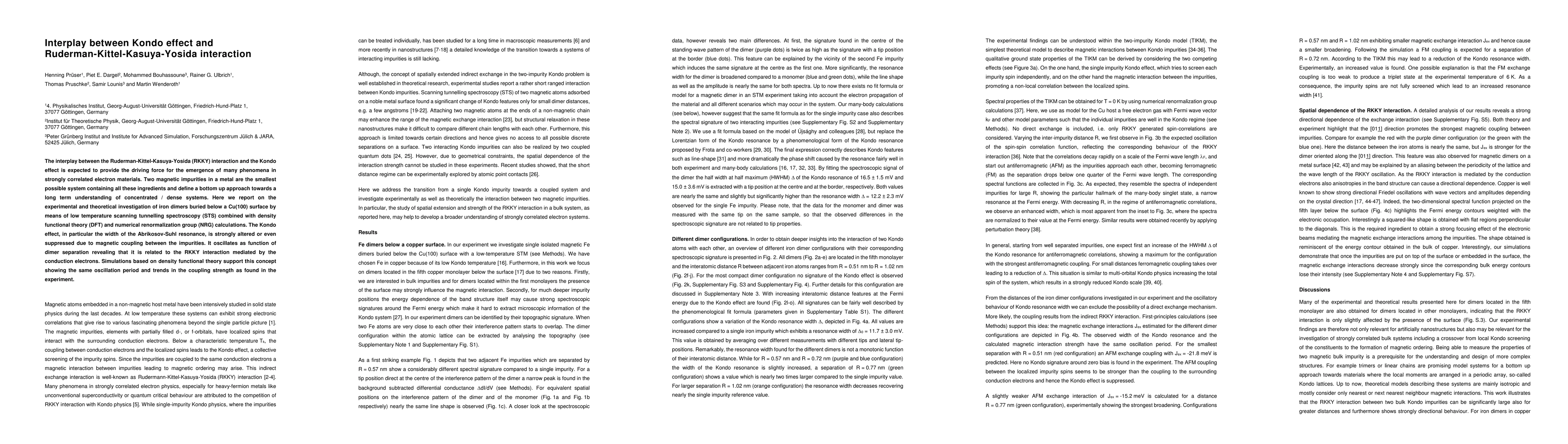 This study investigates the interplay between the Kondo effect and RKKY interaction in iron dimers on a Cu(100) surface using low-temperature scanning tunneling spectroscopy and theoretical simulations. The Kondo effect's resonance width is significantly altered by magnetic coupling between the impurities, oscillating with dimer separation due to RKKY interaction mediation, corroborated by DFT and NRG calculations.