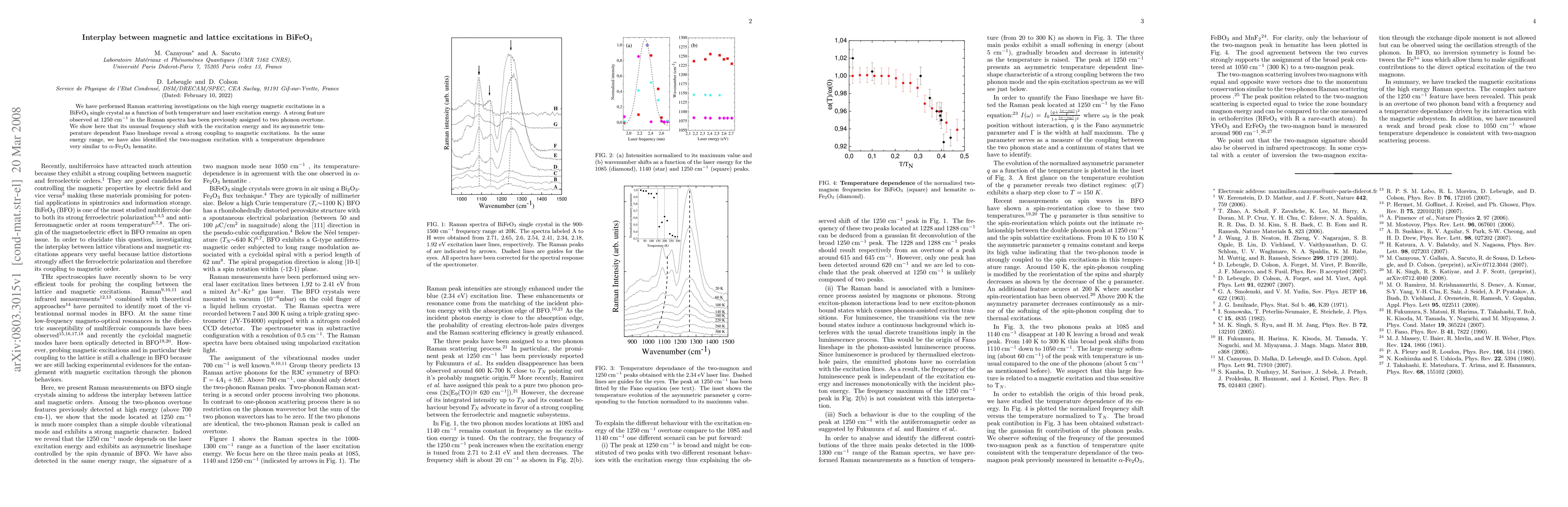 We have performed Raman scattering investigations on the high energy magnetic excitations in a BiFeO$_3$ single crystal as a function of both temperature and laser excitation energy. A strong feature observed at 1250 cm$^{-1}$ in the Raman spectra has been previously assigned to two phonon overtone. We show here that its unusual frequency shift with the excitation energy and its asymmetric temperature dependent Fano lineshape reveal a strong coupling to magnetic excitations. In the same energy range, we have also identified the two-magnon excitation with a temperature dependence very similar to $\alpha$-Fe$_2$O$_3$ hematite.